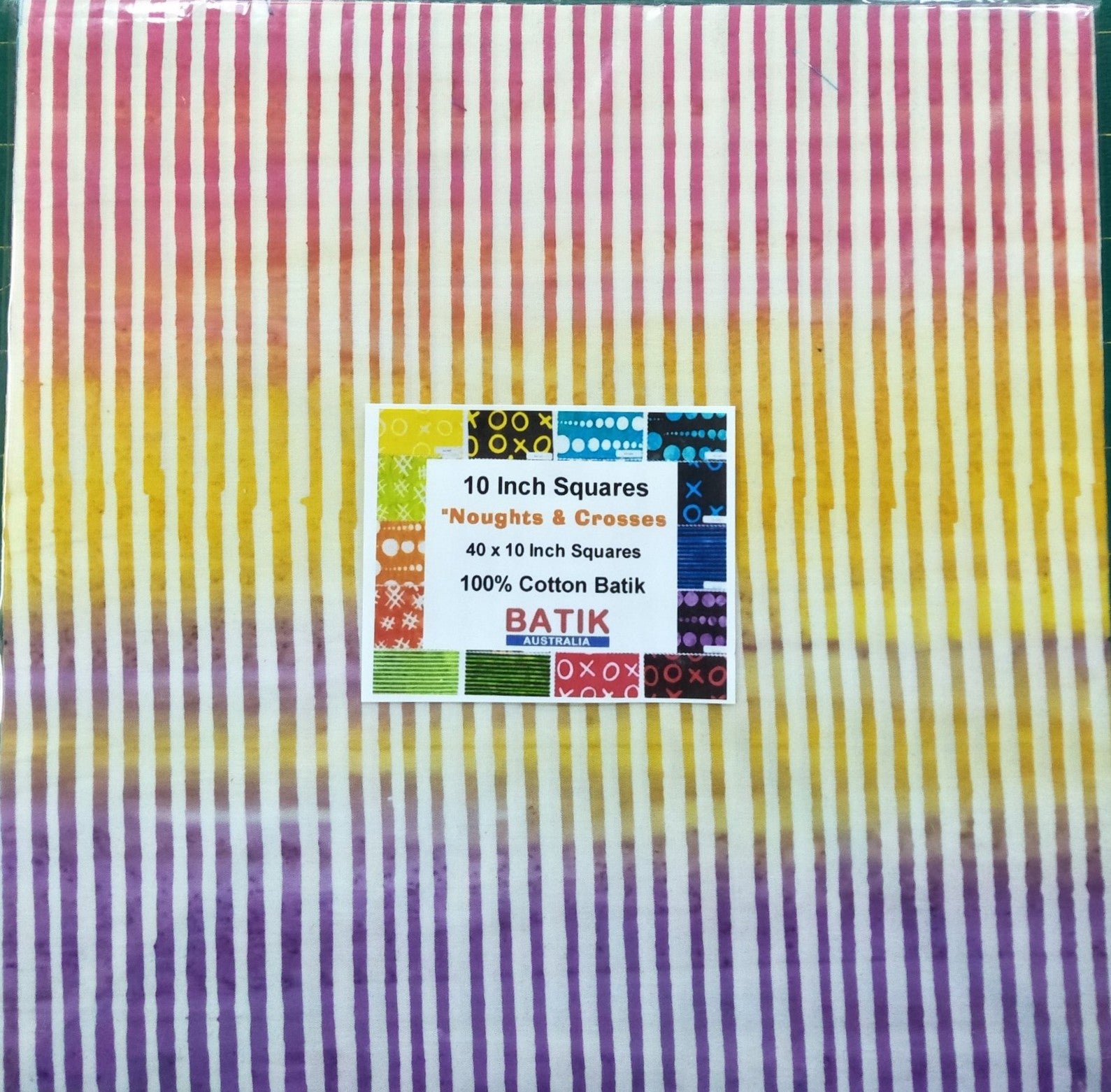 Bring a playful pop of colour to your next quilt with the Batik Australia “Noughts & Crosses” 10″ Square Pack. Hand-dyed using traditional batik techniques, each piece explodes with vibrant, painterly stripes and subtle nought-and-cross motifs—perfect for adding movement and depth to modern patchwork projects.