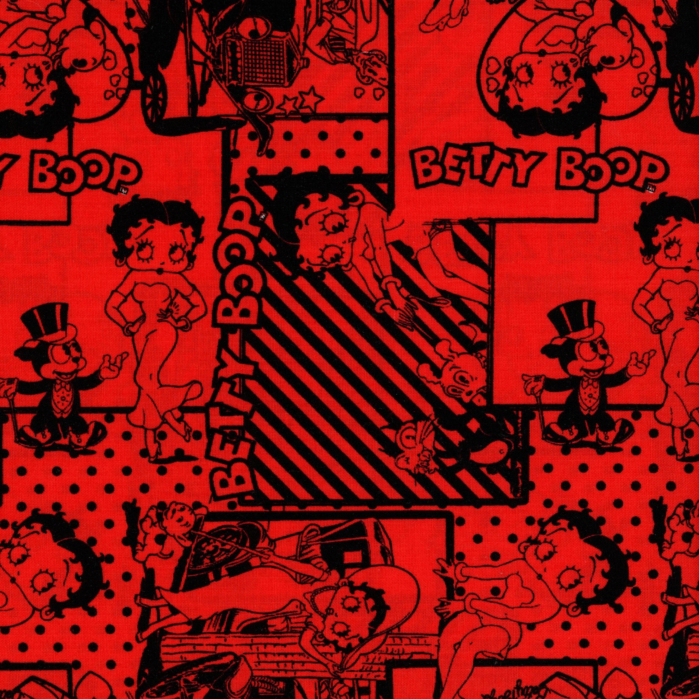 Make a bold statement with this striking Betty Boop print from Camelot Fabrics. Set on a vivid scarlet red background, the design features an all-over montage of classic Betty Boop line art in deep black. From playful poses to vintage-era scenes, each illustrated panel adds charm and personality while the contrasting stripes and polka dots bring extra visual energy.