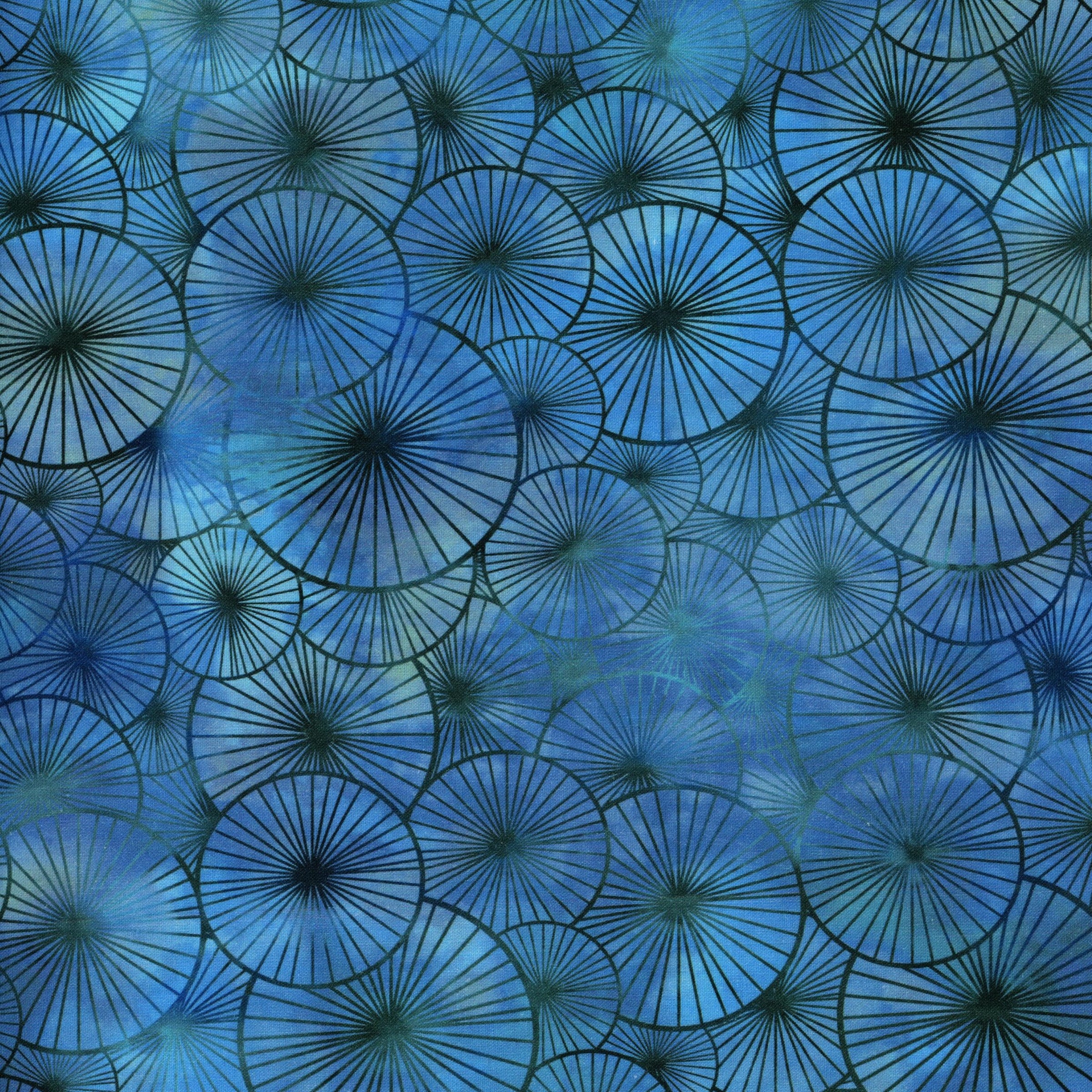 Bring a sense of tranquil elegance to your next quilting project with Seasons by Jason Yenter for In the Beginning Fabrics. This design features a captivating arrangement of radiating circular patterns in deep shades of indigo and sapphire, reminiscent of glowing lanterns against a twilight sky. The layered batik-inspired texture adds beautiful depth and movement, perfect for adding visual interest and sophistication to your creations.