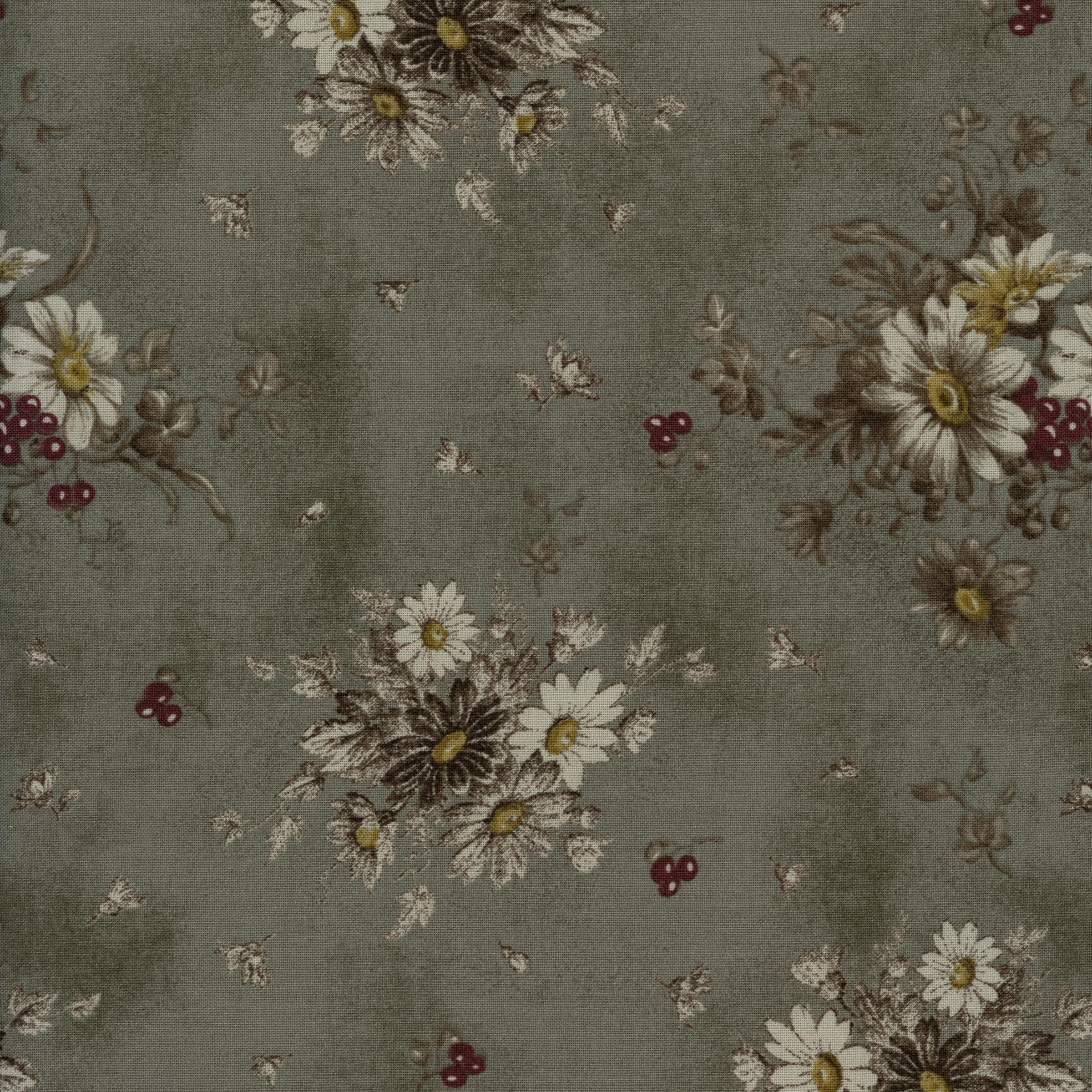Softly elegant and beautifully understated, Dark Gray Daisy Bouquet from Kinkame’s European Taupe XI collection exudes timeless charm. This sophisticated design features delicate daisies and tiny berry accents scattered across a muted gray background with a gently textured, painterly finish. Perfect for quilters who appreciate subtlety and refinement, this print blends seamlessly with other taupe tones for a cohesive and classic look.