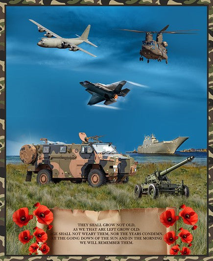 Pay homage to Australias armed forces with the Respect Tribute Panel by KK Fabrics. This striking commemorative fabric features a powerful military scene with aircraft, armoured vehicles, artillery, and naval ships set against a vivid blue sky. Framed with a camouflage border, the composition is anchored by the iconic Ode of Remembrance and symbolic red poppiesa heartfelt visual dedication to those who have served.