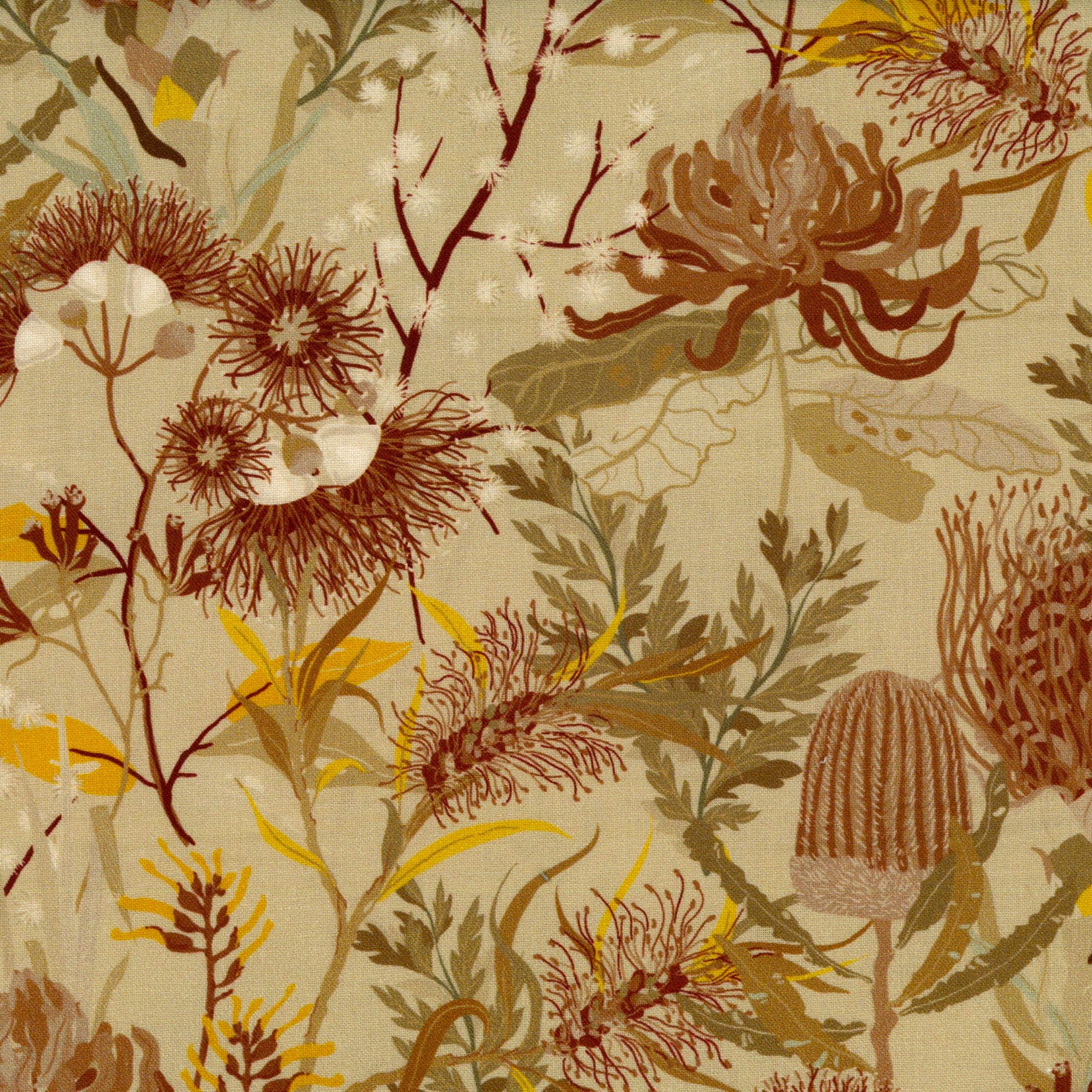 Noras Natives Bushland Neutrals from the Devonstone Collection showcases Australias most iconic flora in a warm, earthy palette. Featuring flowering gums, banksias, waratahs, and wattle in gentle tones of rust, mustard, taupe, and cream, this design evokes the quiet strength and subtle beauty of the Australian bush. A perfect choice for nature-lovers and elegant Australiana quilts.