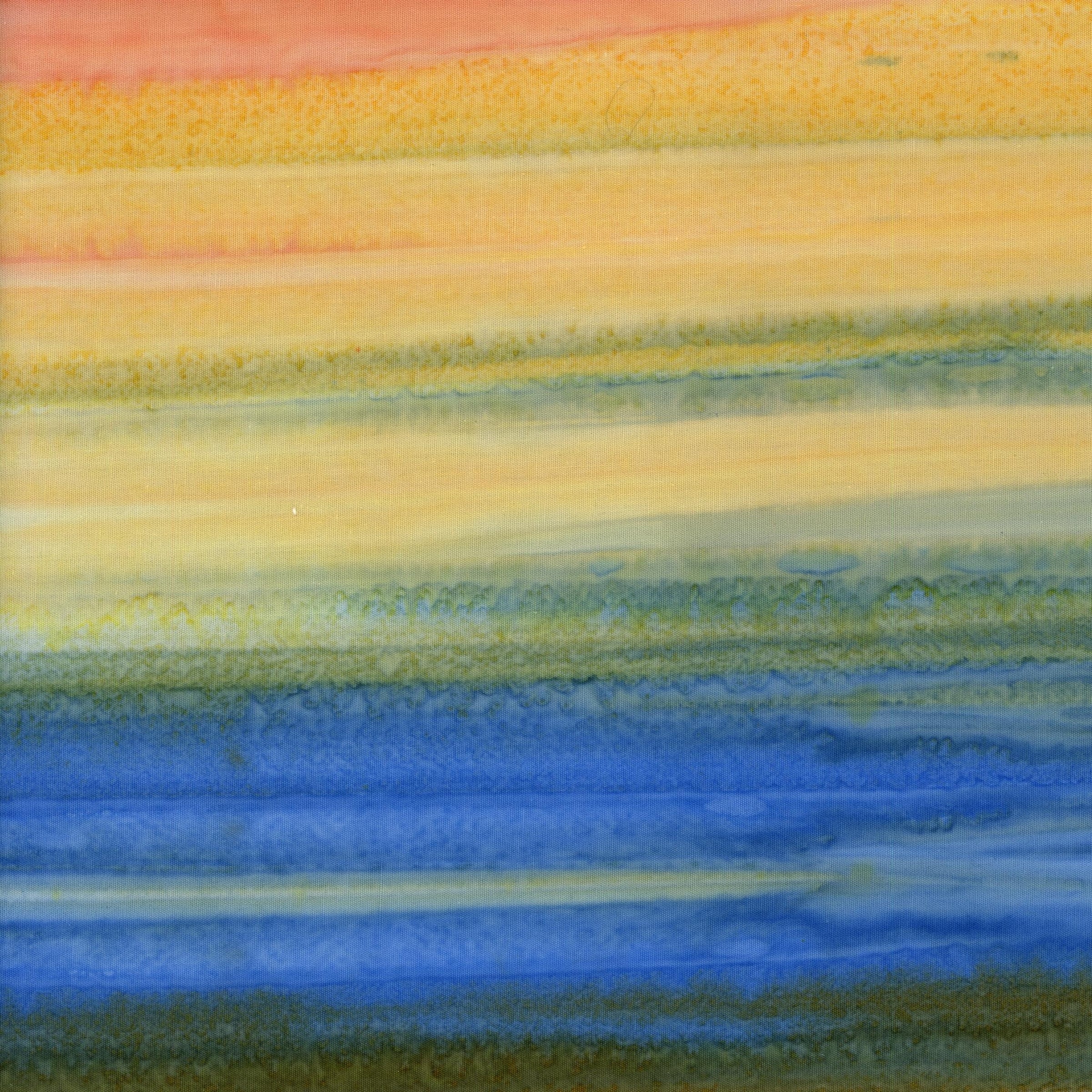 Bring your projects to life with the vibrant beauty of Sunset Over Bay from Ayu Batiks. This richly coloured batik fabric features a painterly ombr that transitions through coral, golden yellow, moss green, and ocean blue. The soft horizontal bands and organic watercolour textures evoke the brilliance of a coastal sunset reflecting off calm waters. Its a perfect focal fabric for landscape quilts, bold backings, or standout strips in patchwork projects.