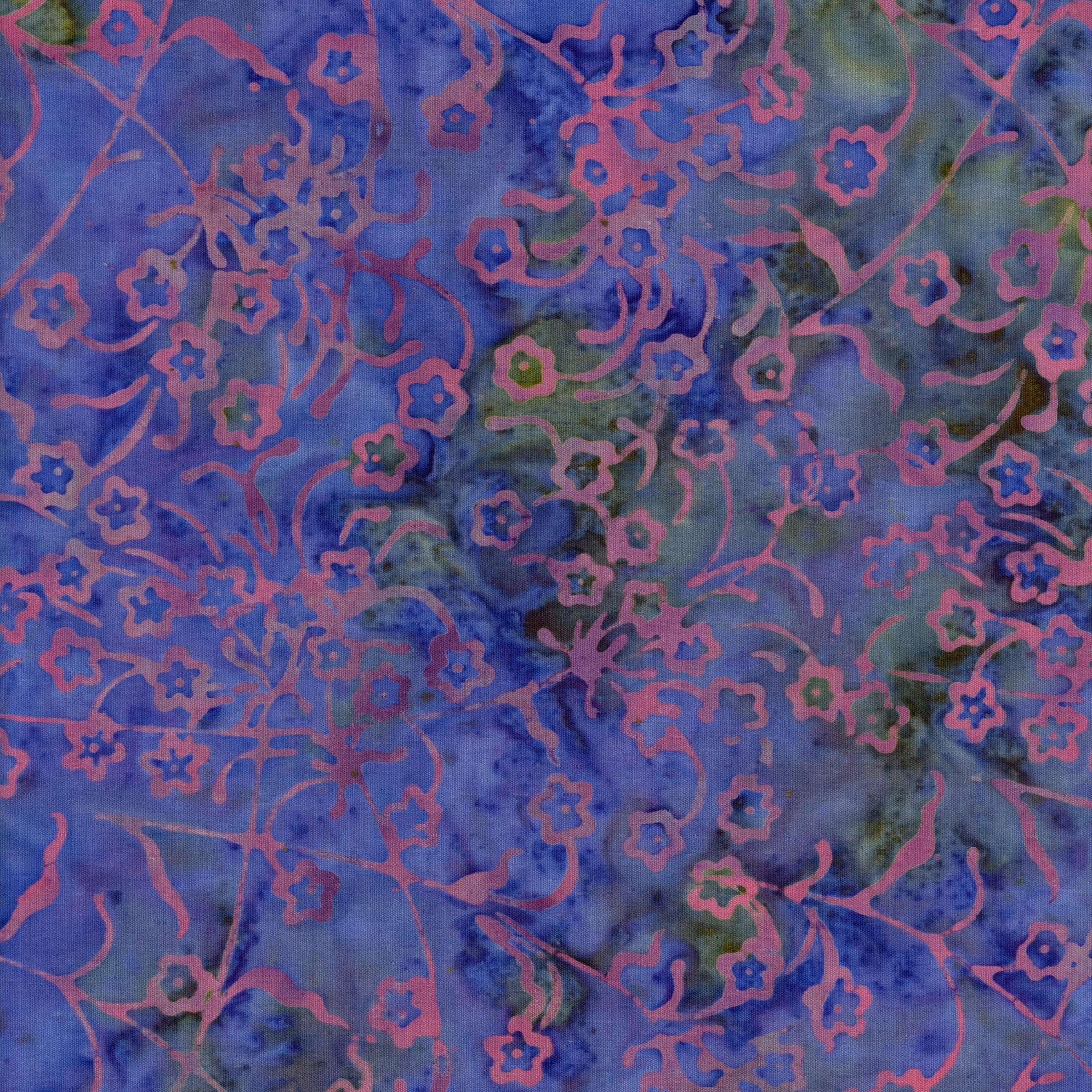 • Design: Flowing pink floral vines on a deep blue and green marbled batik background