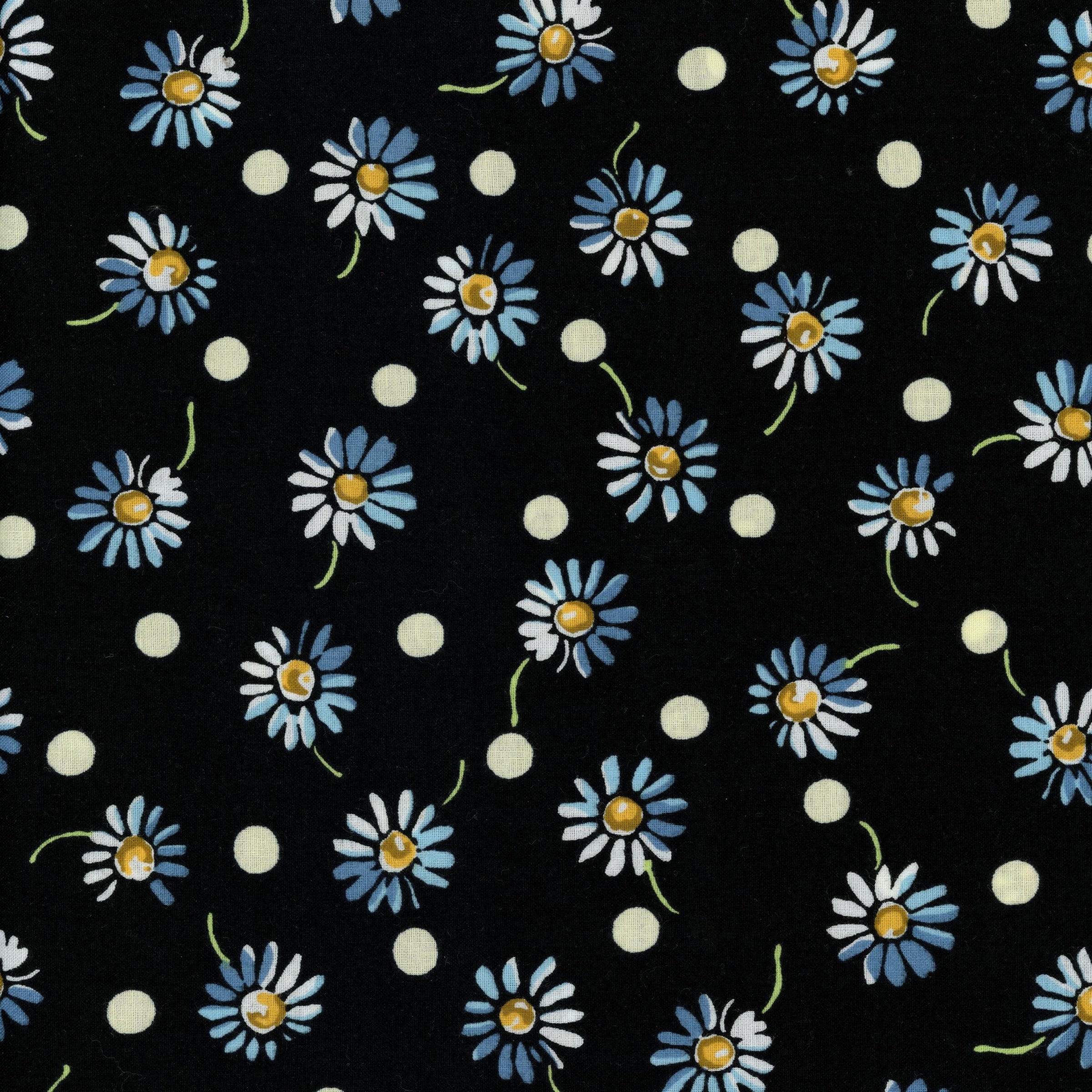 Design: Blue and white daisies with yellow centres and cream polka dots on a black background