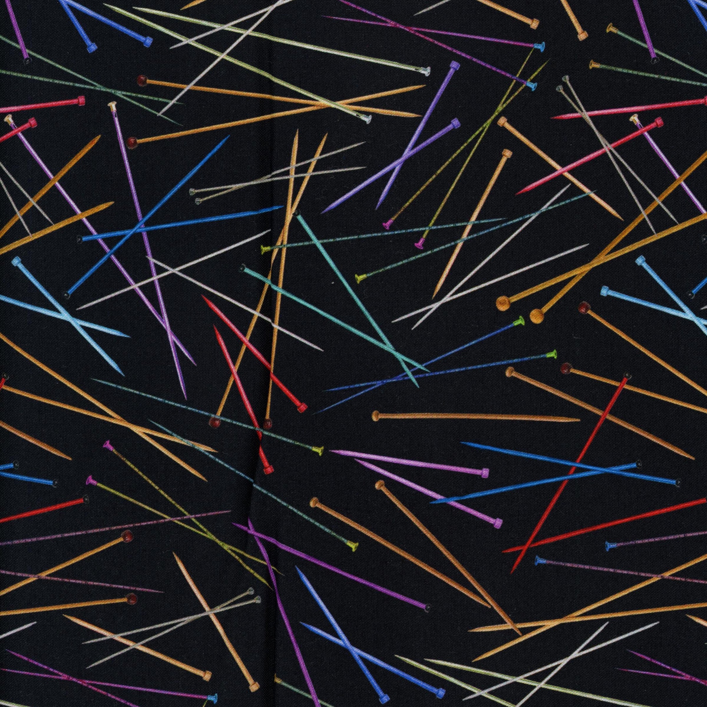 Bright, chaotic, and full of fibre-arts flairTangled Needles from the Knit One, Purl Two collection by Aimee Stewart for Michael Miller and KK Fabrics is a visual celebration of all things knitting. Scattered knitting needles in vivid rainbow tones criss-cross against a deep black background, mimicking the energetic creativity of a bustling craft room.