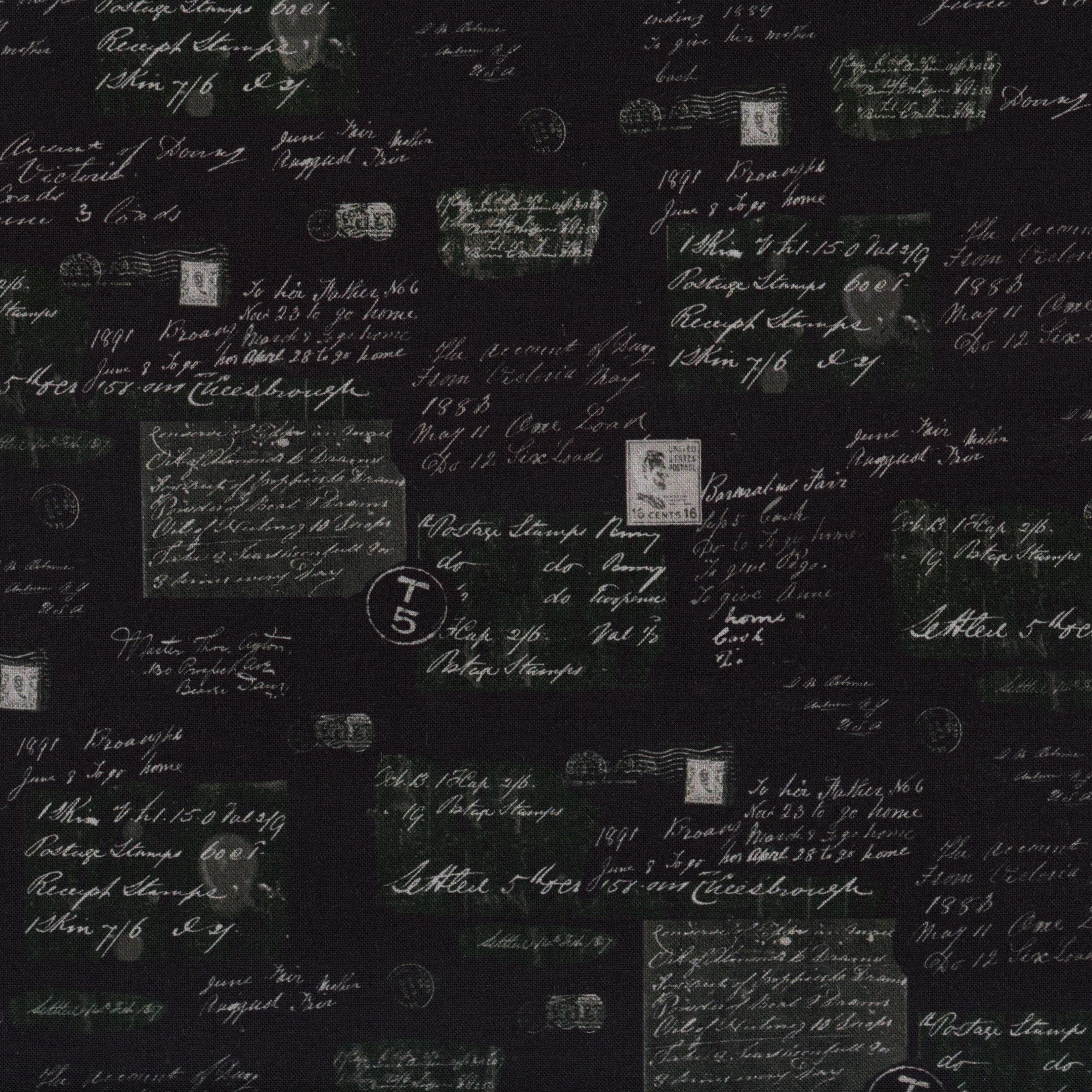 Bring an air of vintage mystery to your next sewing project with Midnight Postmarks from the What's Poppin? collection by Michael Miller for KK Fabrics. This moody design features handwritten script, postmarks, postage stamps, and envelopes layered across a rich black backgroundevoking the charm of forgotten letters and timeless correspondence. The monochrome and deep green palette adds a subtle depth, making this print a standout choice for modern and traditional projects alike.