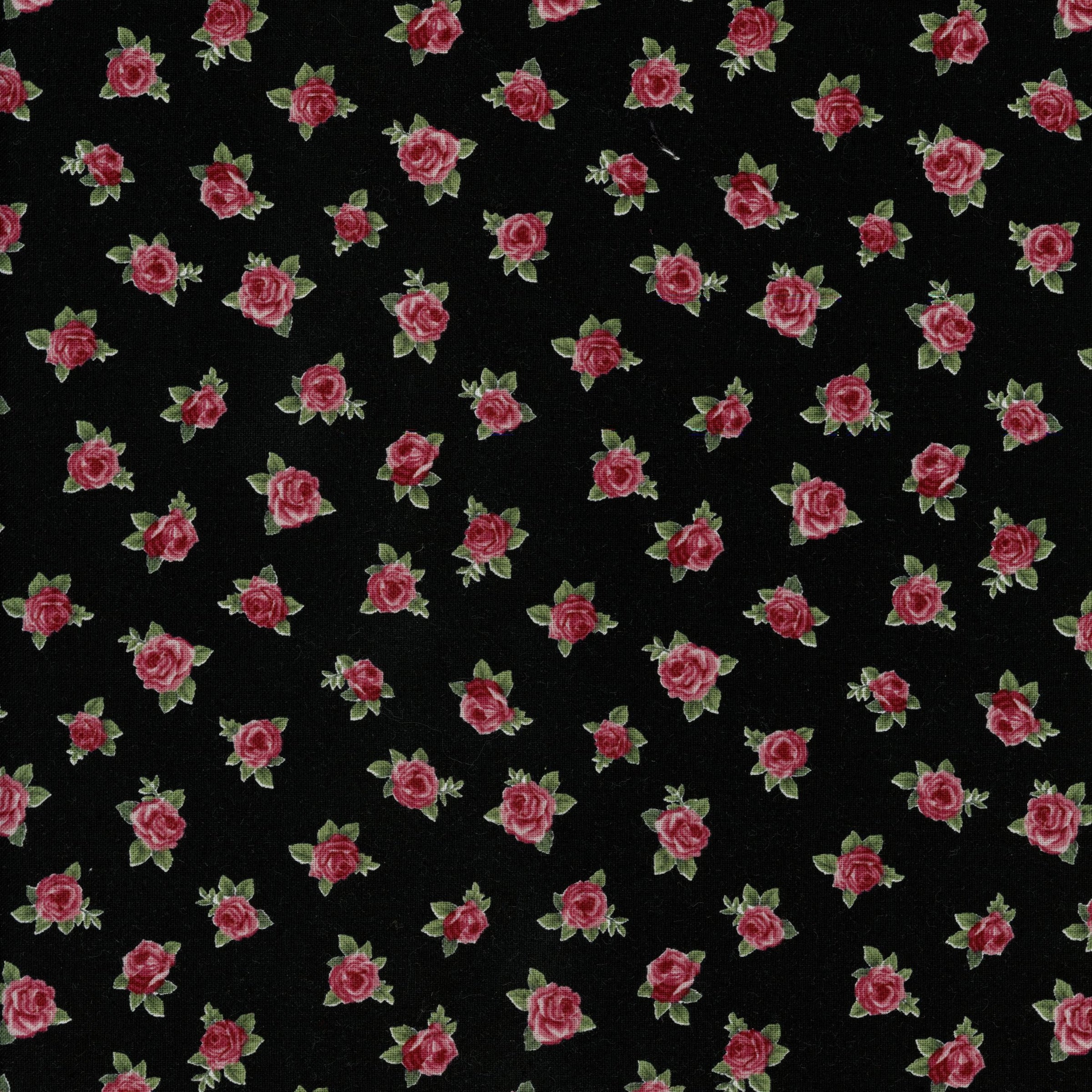 This charming fabric from the Stof Fabrics Bella Rosa collection features dainty red rosebuds scattered evenly across a deep black background. The delicate floral sprigs with soft green leaves create a timeless, romantic look perfect for both modern and traditional sewing projects. Its subtle elegance makes it versatile for patchwork as well as statement pieces.