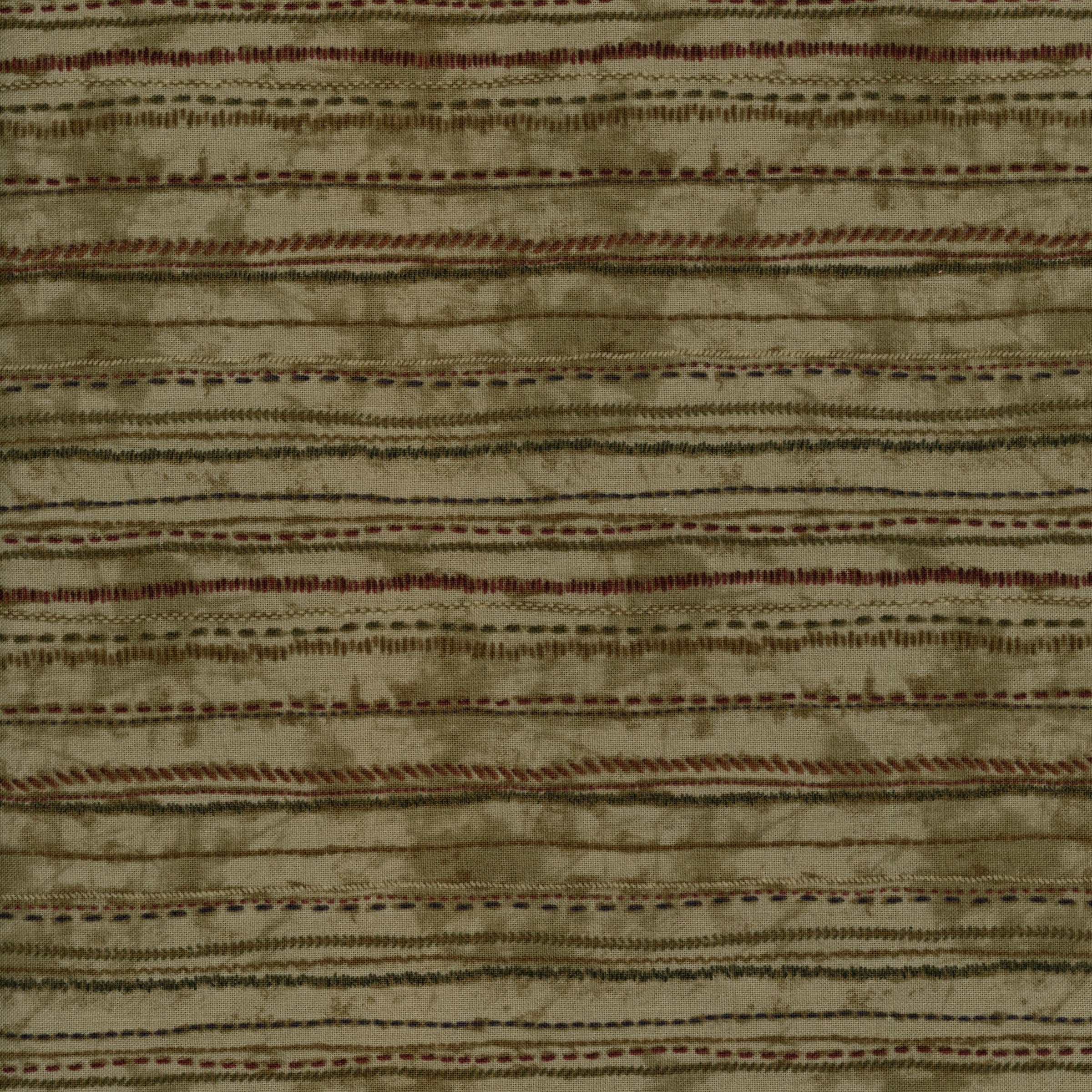 Design: Irregular stitched stripes in earthy sage, olive and russet on a mottled khaki base