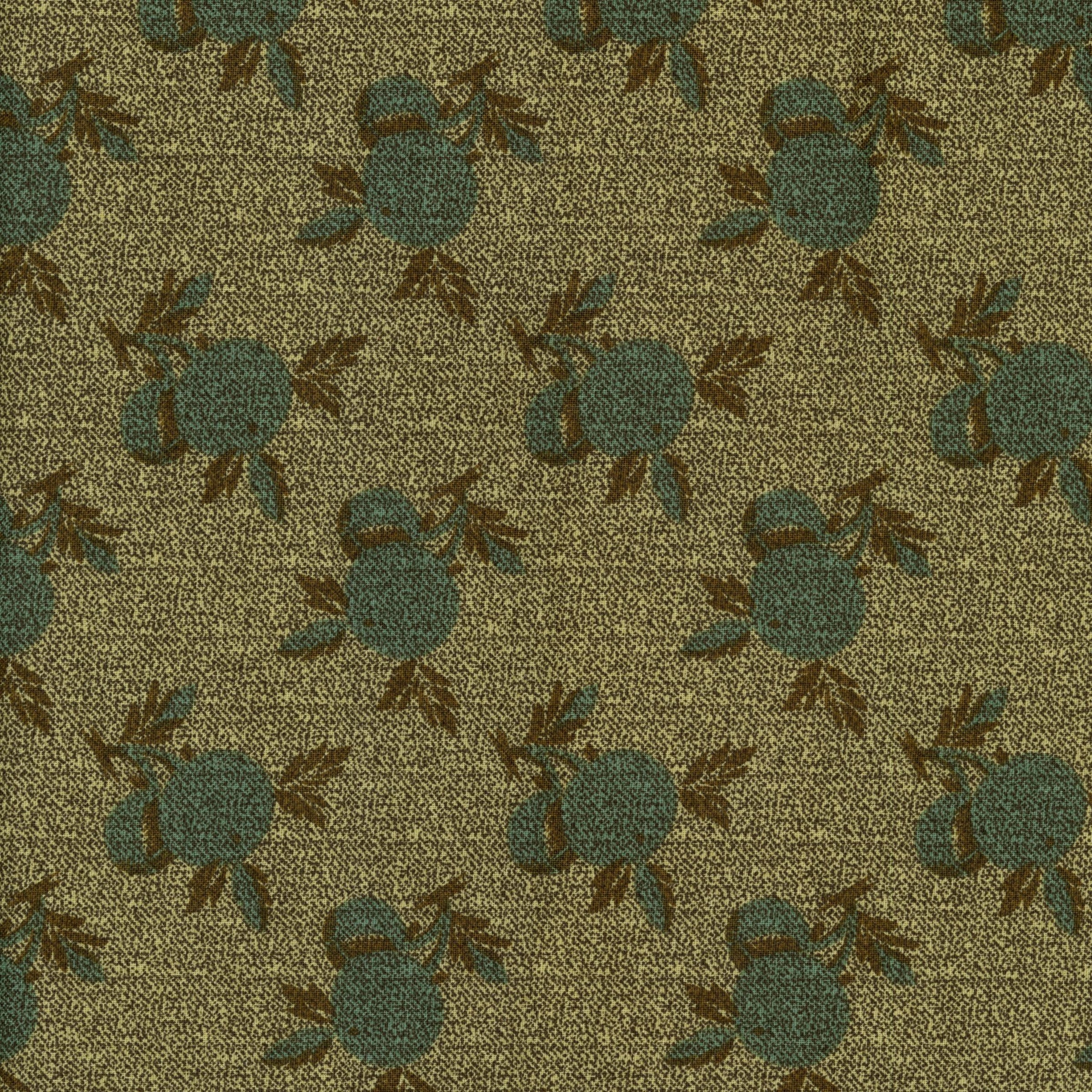 Design: Teal crab apples with brown foliage on a speckled olive ground