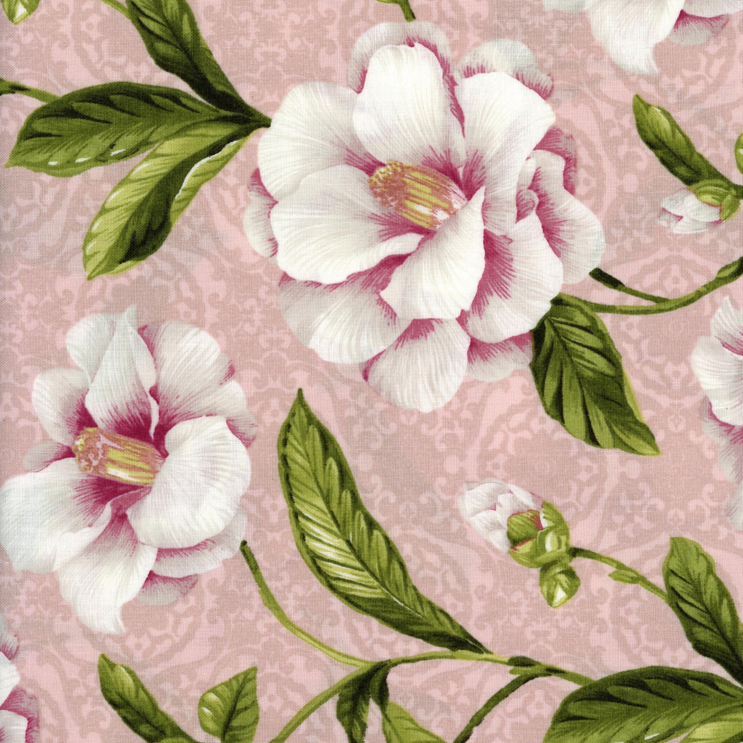 Elegant and timeless, Blush Garden Bloom from the Cecilia collection by Camelot Cottons features large, beautifully detailed white and pink blooms with lush green leaves set against a soft blush background. Subtle damask detailing adds an extra touch of sophistication, making this fabric a perfect choice for creating romantic, vintage-inspired quilts, décor, or apparel. Its delicate palette balances freshness with classic floral beauty.