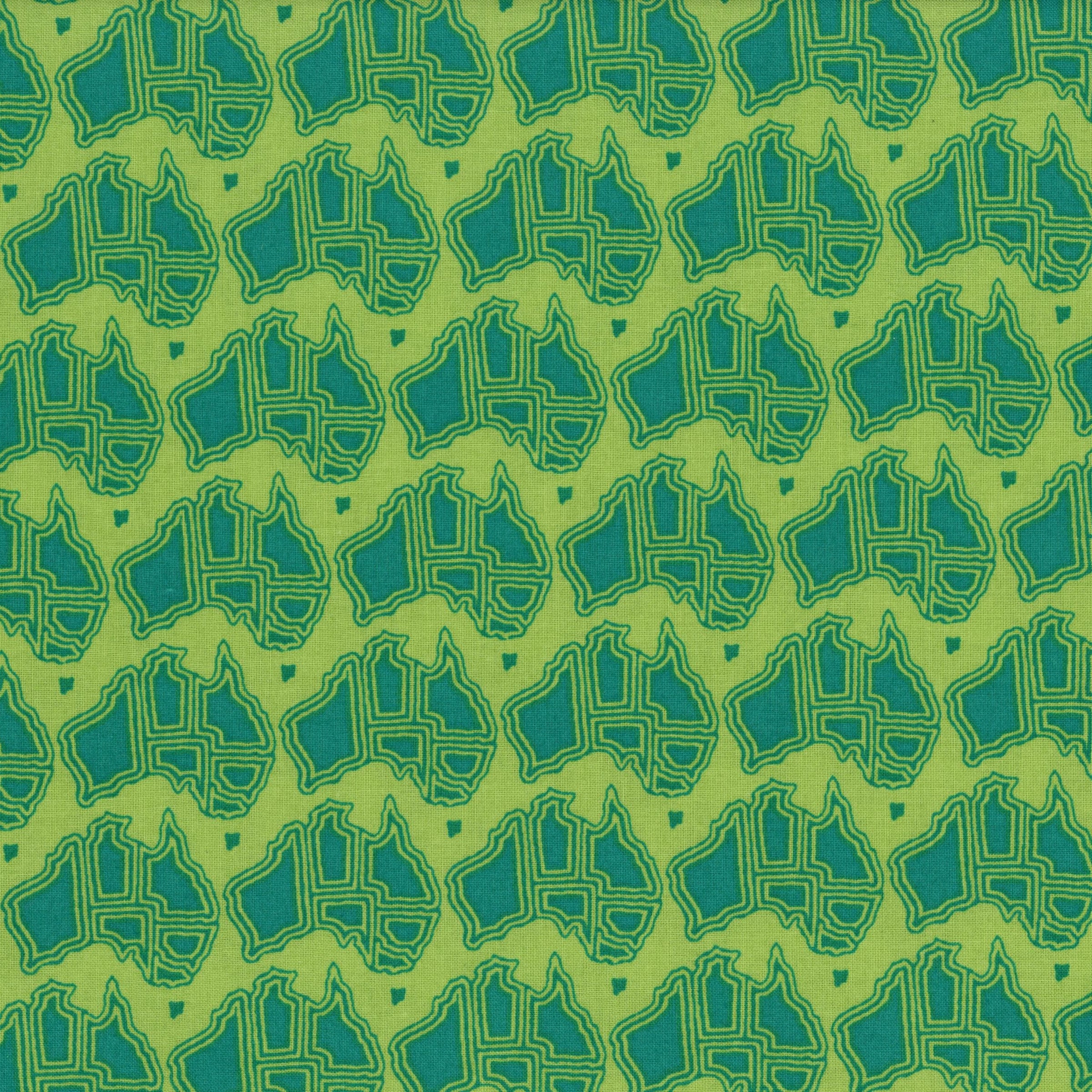• Design: Repeating map outlines of Australia in teal and green tones with geometric line details