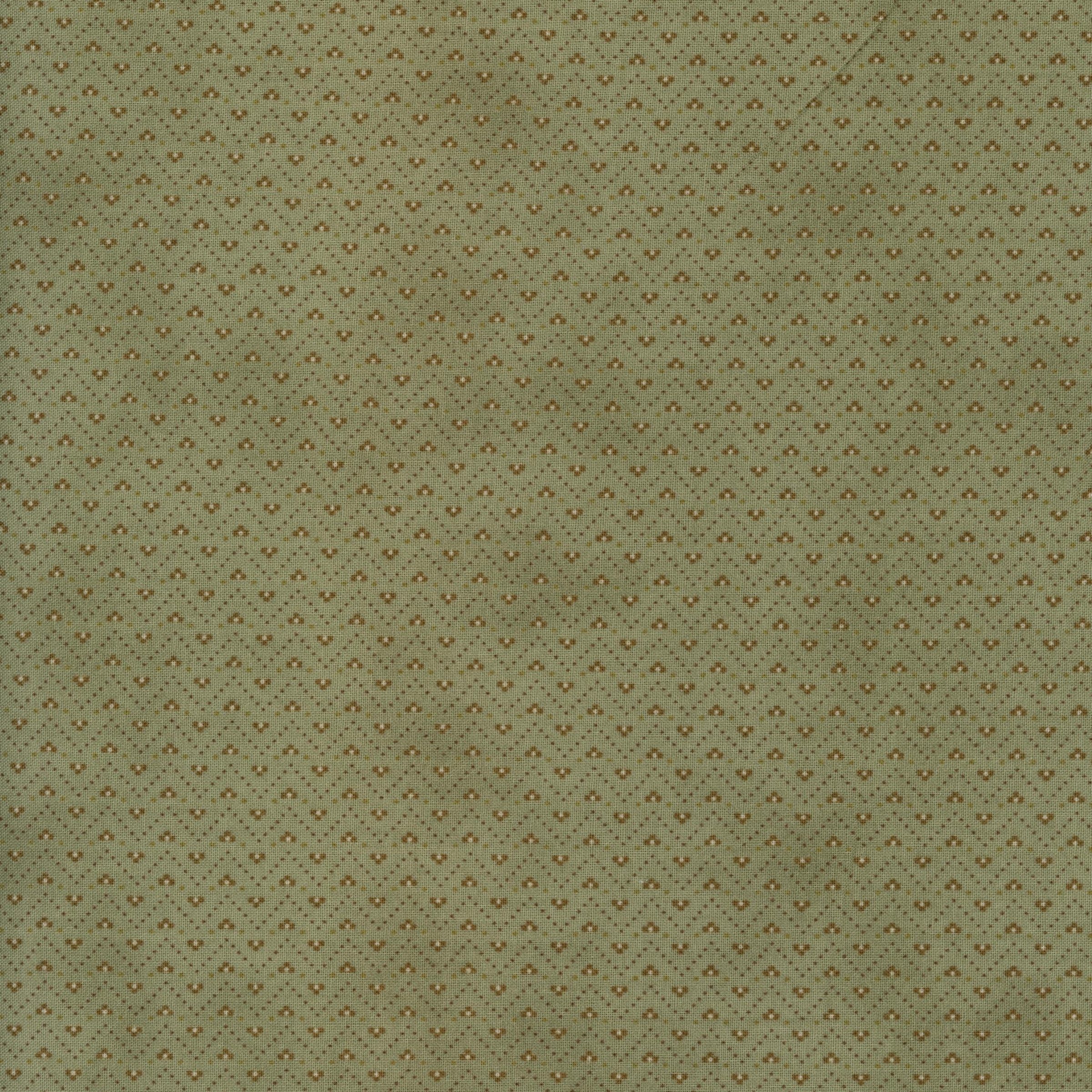 Design: Small-scale dot and sprig pattern in warm olive and gold tones on a muted green base