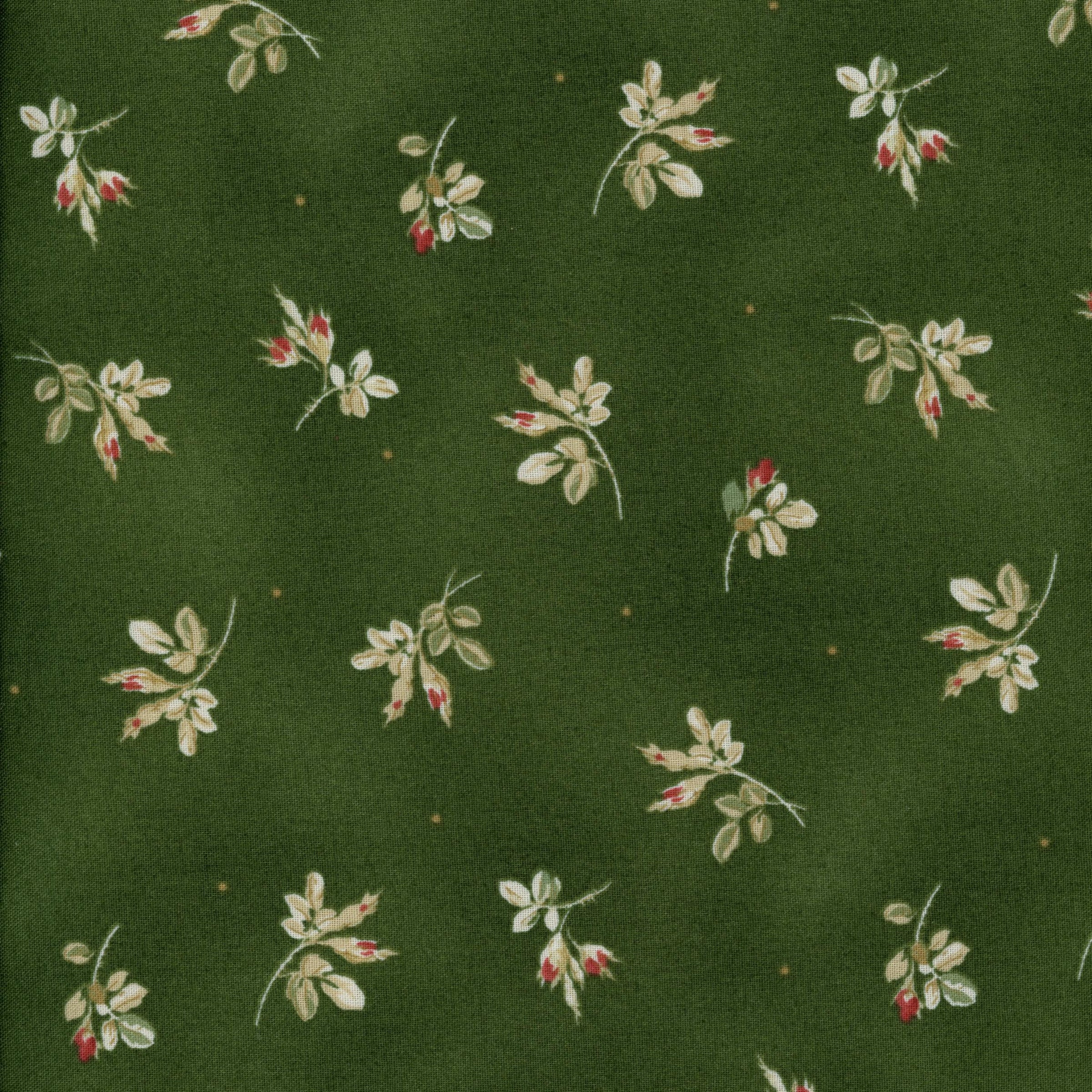 The Tomorrow's Promise Leaf Sprig Fabric by Maywood Studio features a delicate and timeless design, perfect for classic quilting and vintage-style projects. Small leafy sprigs with subtle red berry accents are scattered across a rich forest green background, creating an elegant yet understated look. The soft, traditional colour palette makes this fabric a versatile addition to any fabric collection.