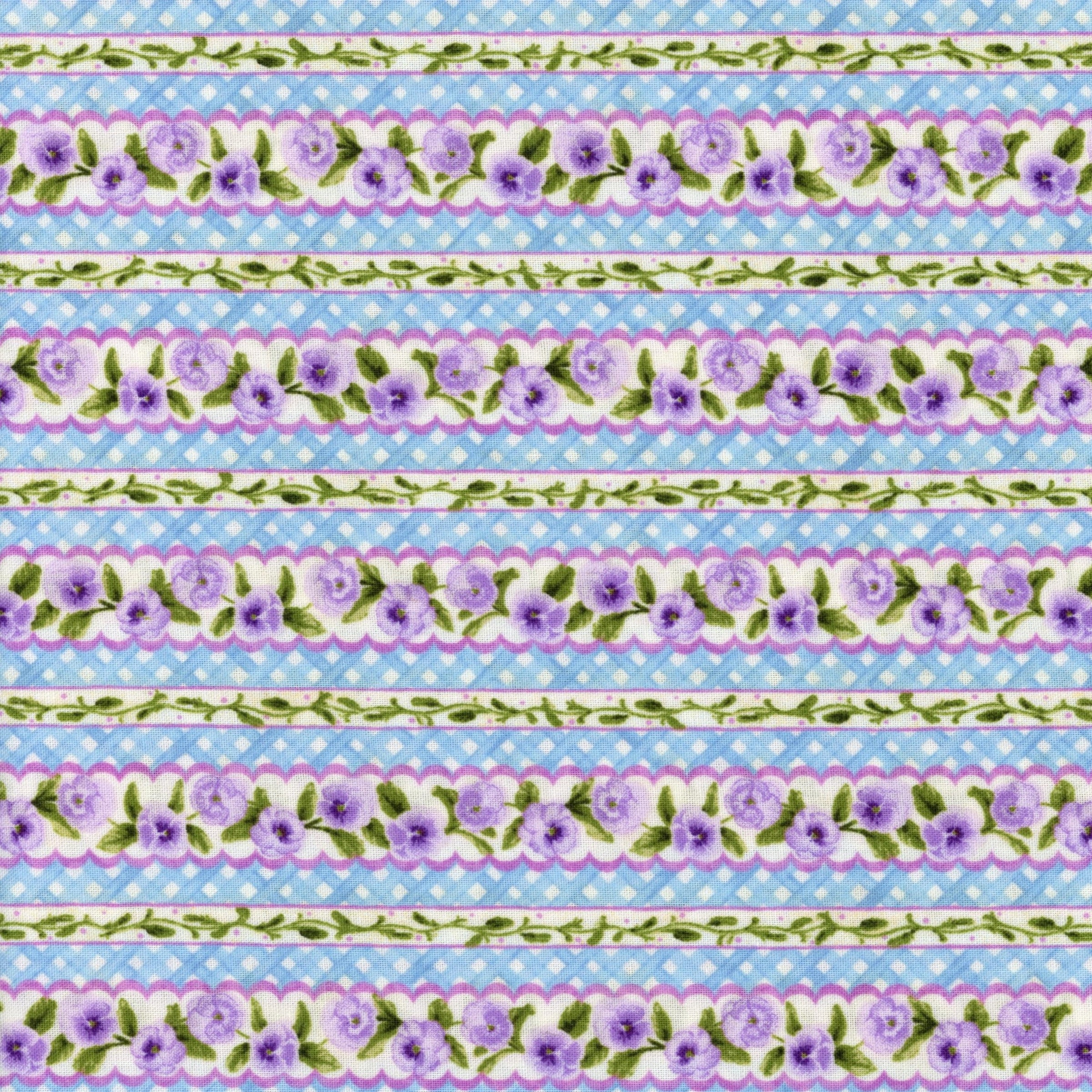 Design: Striped rows of lilac pansies and green vines with blue and white check accents.