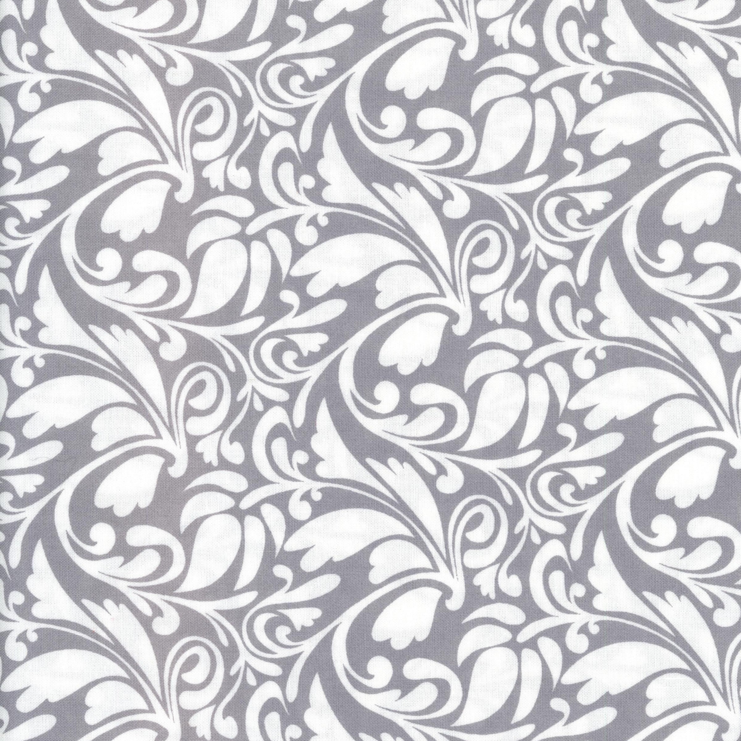 Design: Flowing white scrolls and foliage on a smoky grey background