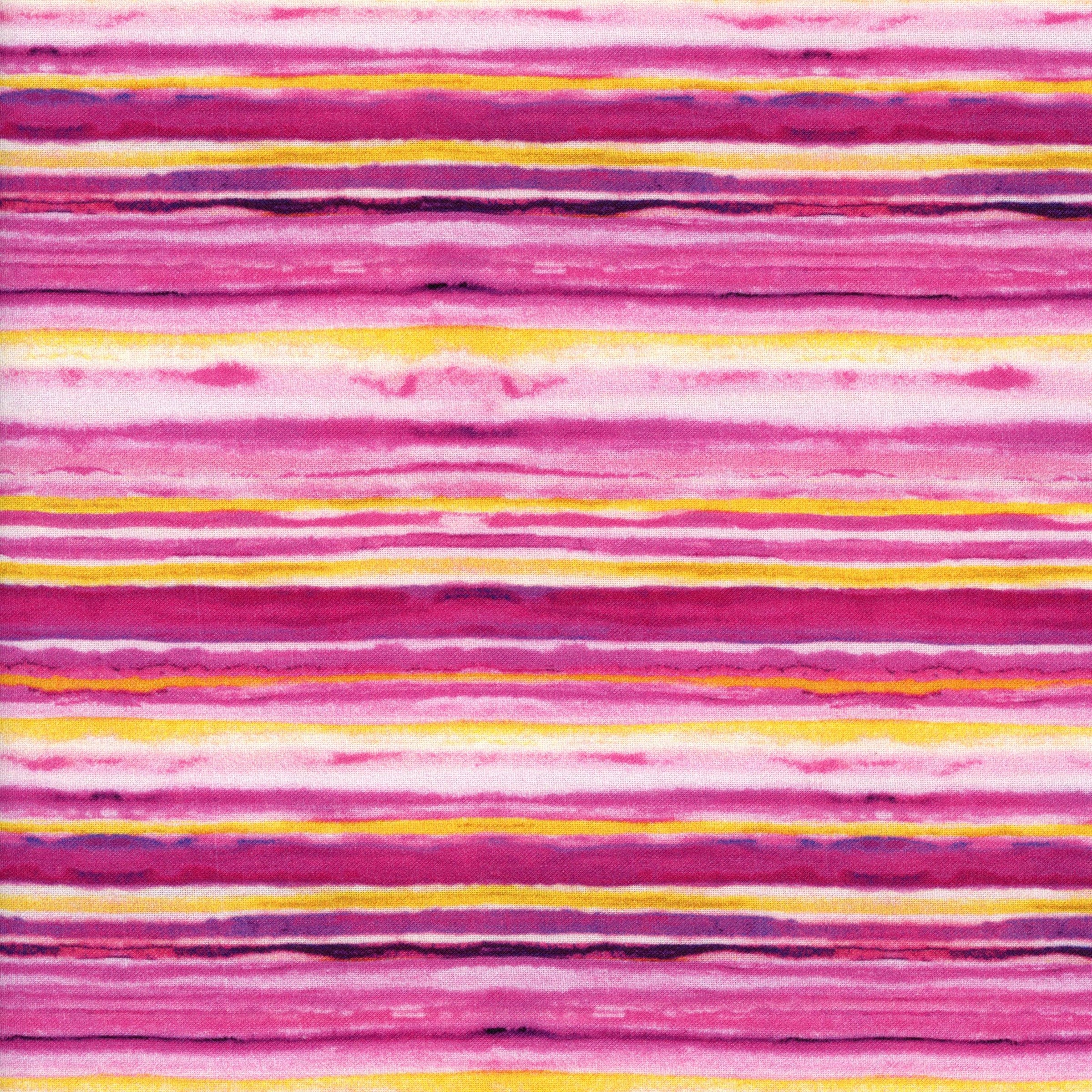 Saturate your sewing with juicy colour thanks to Raspberry Sorbet Stripe from QT Fabrics’ Charlene collection. Hand-painted horizontal bands in raspberry, fuchsia and rose blend seamlessly with zesty streaks of saffron yellow, creating a lively water-colour wash that feels both modern and artisanal. Each cut is slightly different—just like brushstrokes on canvas—so your quilt backs, statement borders or feature blocks will look one-of-a-kind. Vibrant yet versatile, this premium cotton lifts everything from playful kids’ quilts to bold tote linings.