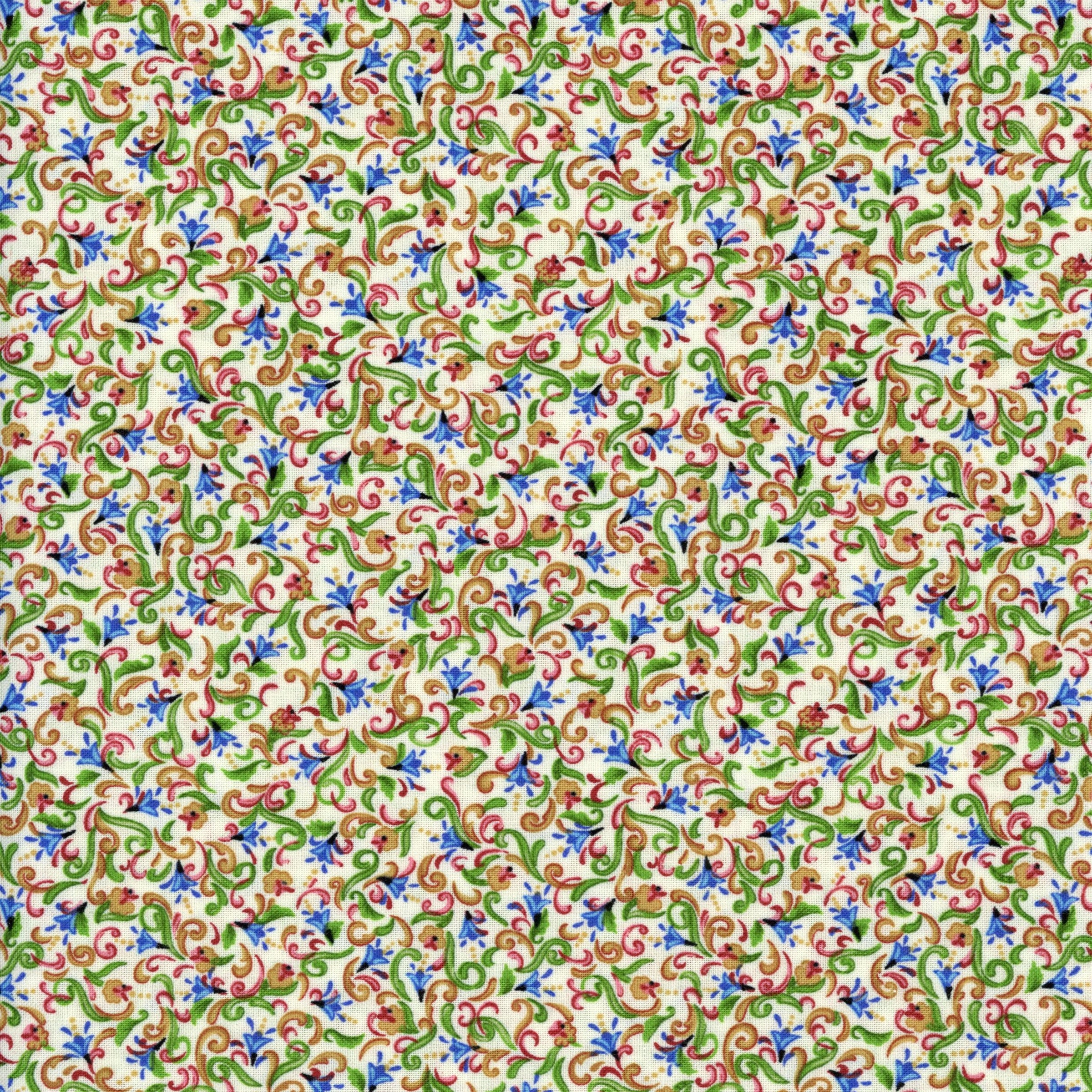 Bursting with colour and charm, Folk Scroll Multi from Red Rooster Fabrics by Jim Shore captures the artist’s signature folk-art style in a lively swirl of colour. This intricate design features flowing scrolls and flourishes in red, blue, green, and gold on a soft cream background, creating a cheerful and timeless pattern. Perfect for adding personality and movement to quilts, borders, or handcrafted home décor.