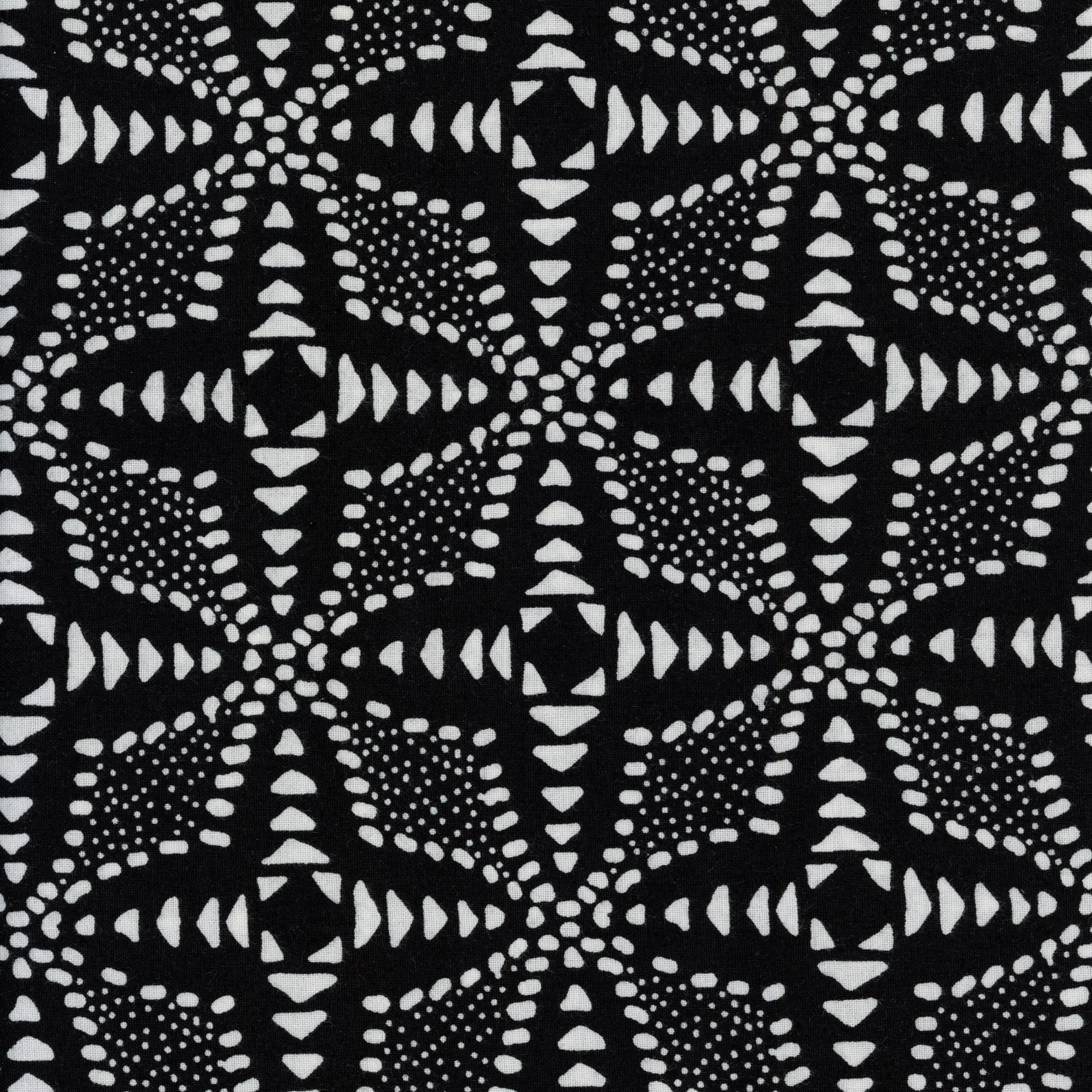 Design: Black background with repeating white geometric star motifs made from dotted and triangular shapes