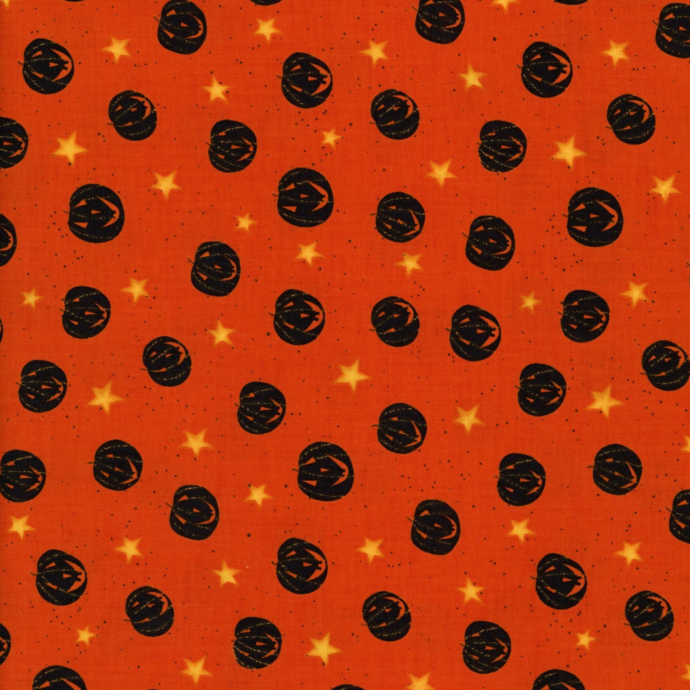 Add a pop of festive fun to your Halloween creations with Witchful Thinking Dark Orange by Dan Di Paolo for Clothworks. This lively fabric features a burnt orange background dotted with black jack-o'-lantern faces and warm yellow stars, creating a playful yet classic Halloween vibe. The scattered polka dot-style layout makes it a great choice for blending, borders, or standing on its own in any spooky season project.