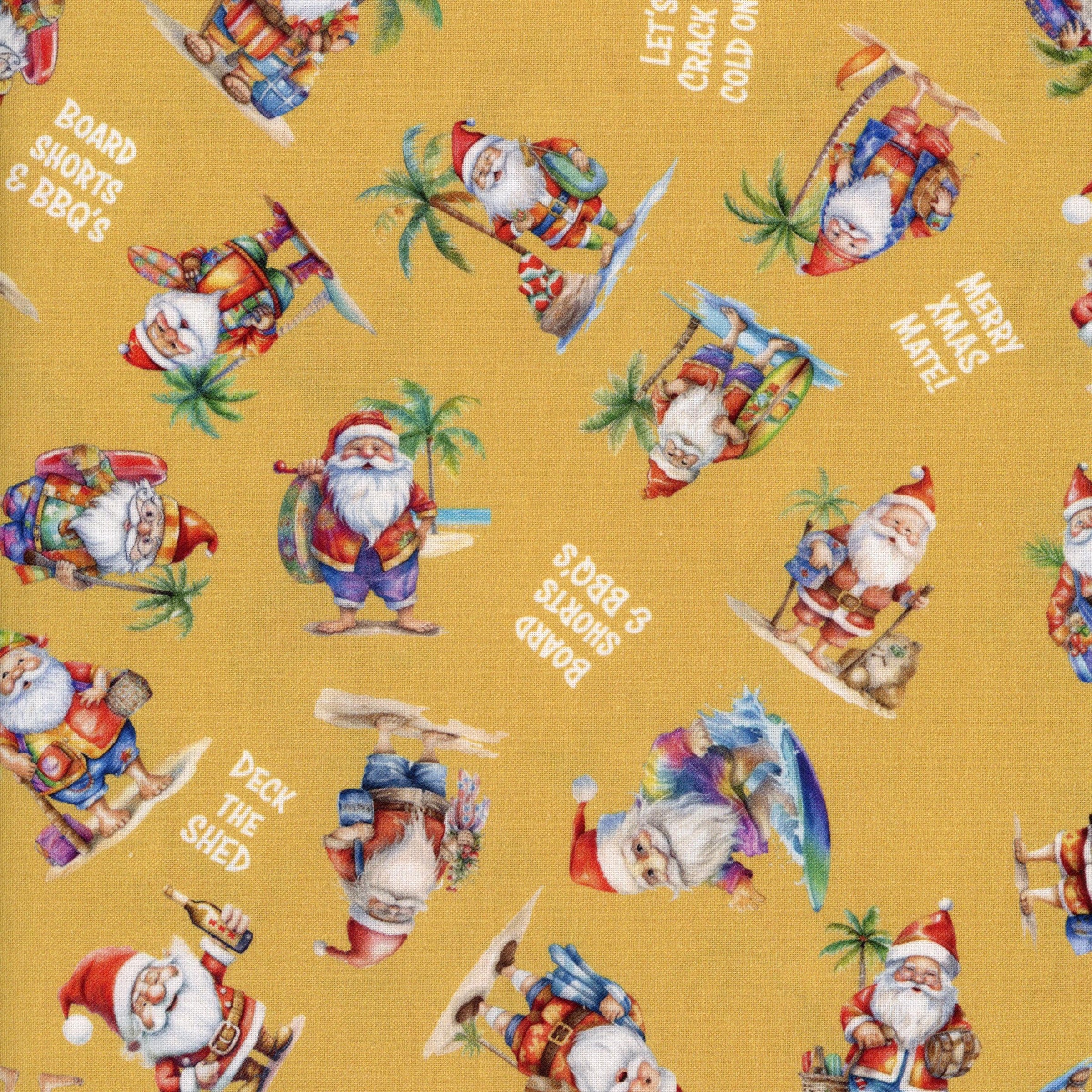 Celebrate Christmas the Aussie way with Summer Santa Mustard from the Old Mate collection by Devonstone Collection. This playful fabric features a series of laid-back Santas dressed in board shorts, enjoying beachside activities, BBQs, and cold drinks under palm treesall set against a rich mustard yellow backdrop. Scattered with cheeky phrases like Deck the Shed and Lets Crack a Cold One, this novelty print brings humour and warmth to festive sewing projects with a distinctly Down Under twist.