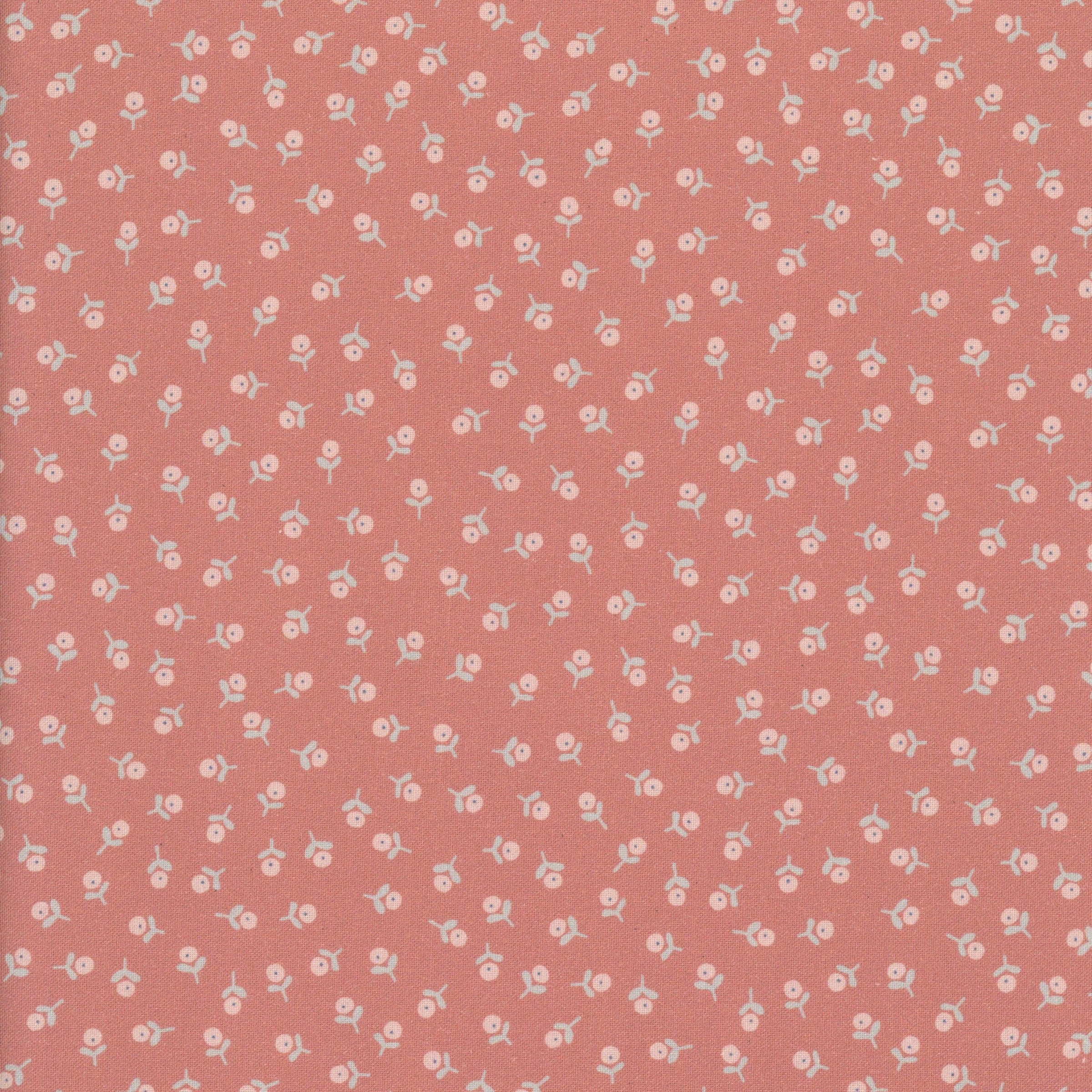 Design: Warm coral base scattered with miniature pink flower buds and soft blue-grey stems for a delicate ditsy look