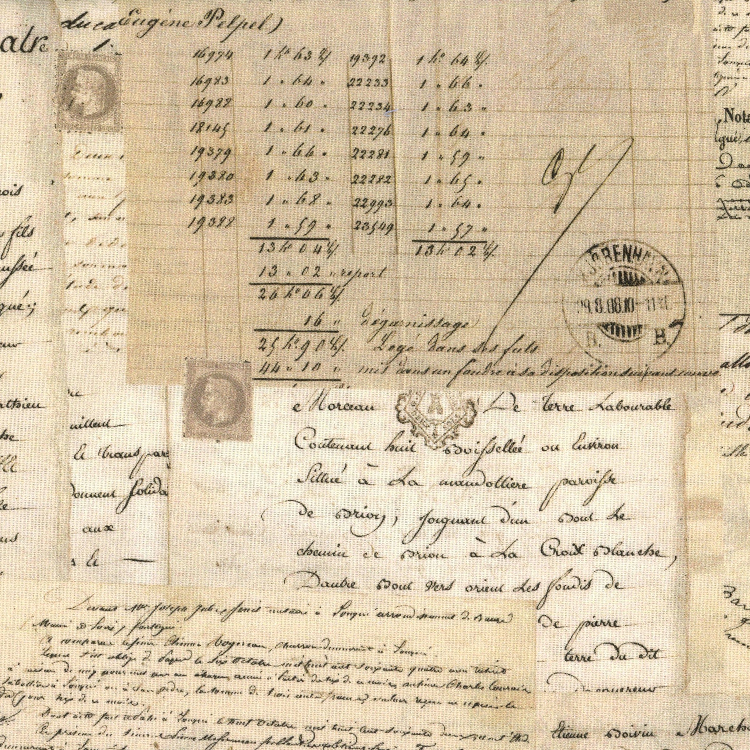 Design: Vintage handwritten letters, stamps, and postmarks on a beige background