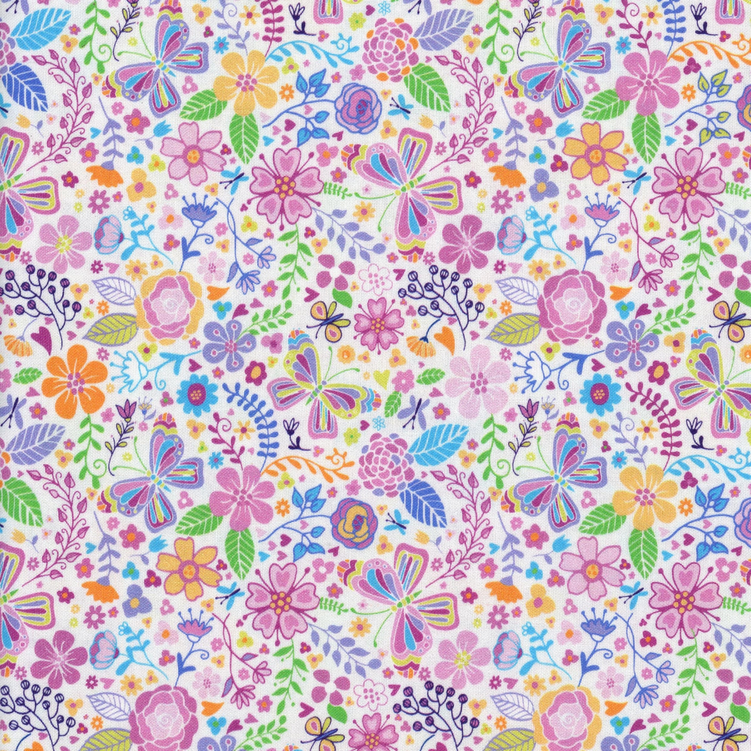 KK Fabrics – Enchanted Garden Backing by Michael Miller Fabrics is a delightful burst of colour and charm. Featuring a lively garden scene of blooming flowers, fluttering butterflies, and leafy stems in shades of pink, purple, orange, yellow, and green, this wide backing fabric radiates cheerful energy. Perfect for adding a playful finish to your quilt or for bright spring-inspired projects, Whimsical Meadow brings a touch of magic to every creation.