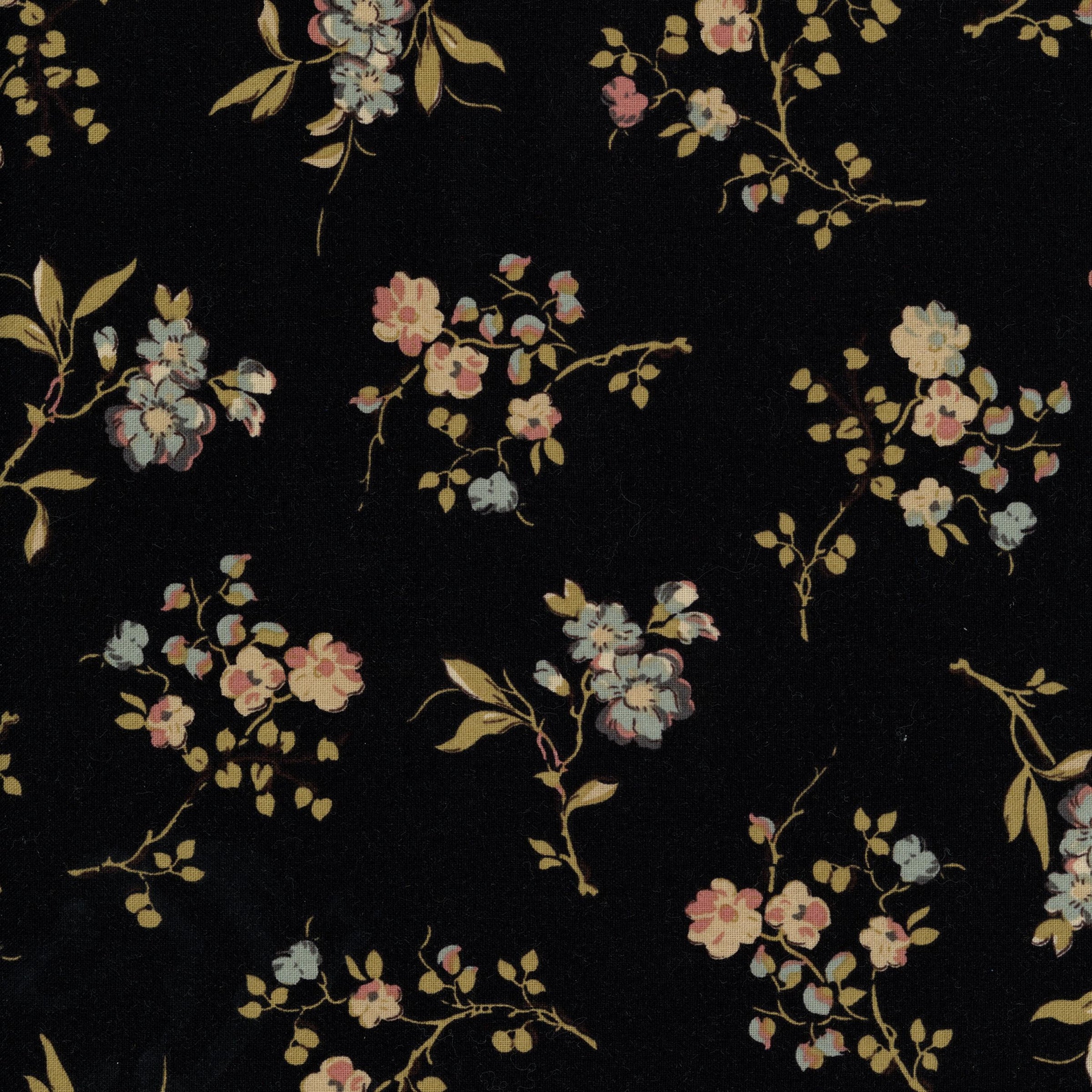 Design: Pastel floral sprigs in pink, blue, and cream on a black background