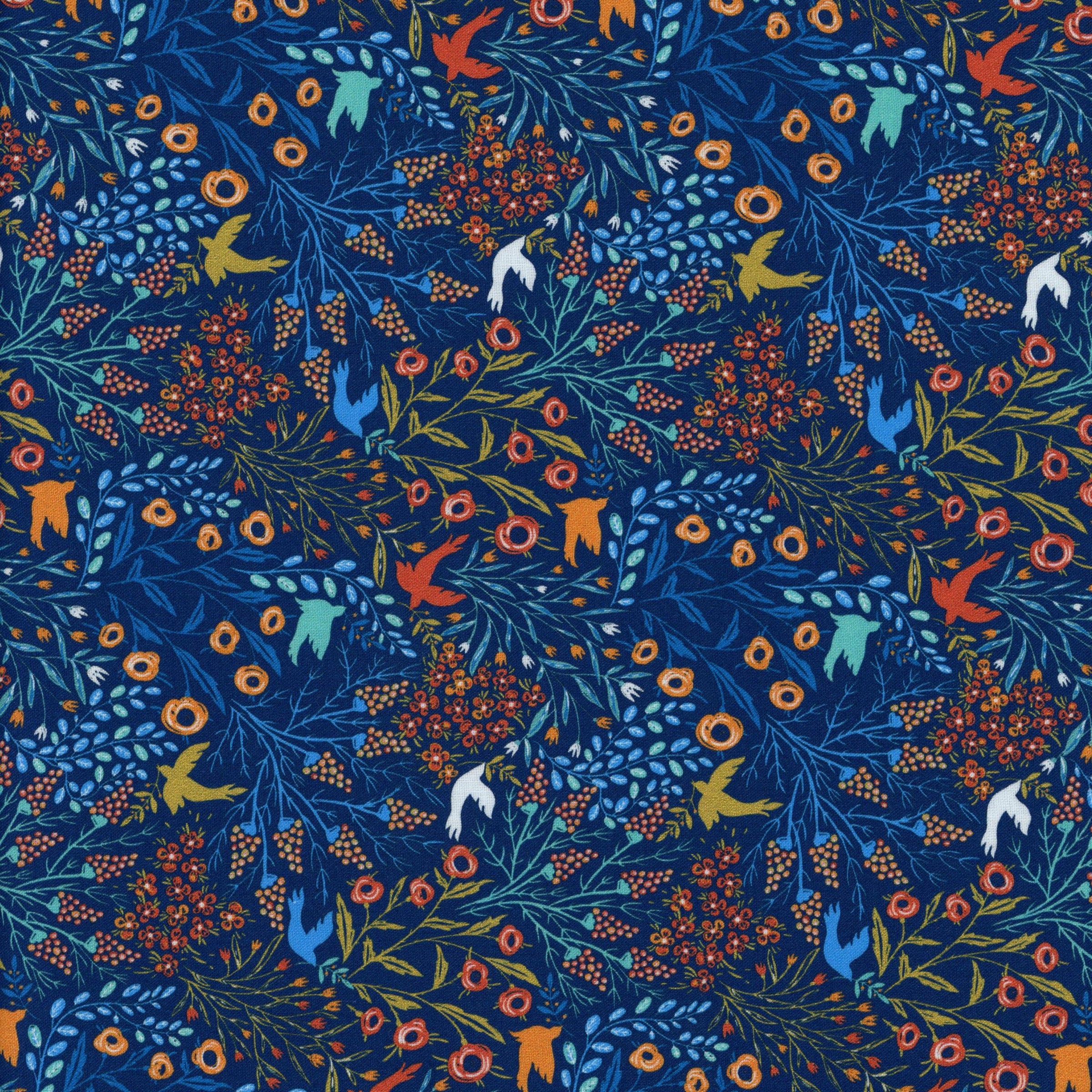 Lloyd Curzon Textiles – Whimsy from In The Beginning Fabrics brings a lively touch of nature to your creative projects. Featuring vibrant birds and stylised botanical elements in tones of teal, orange, mustard, and white against a deep navy background, this design evokes the magic of a whimsical night garden. Perfect for quilts, cushions, and home décor that celebrate colour and movement.