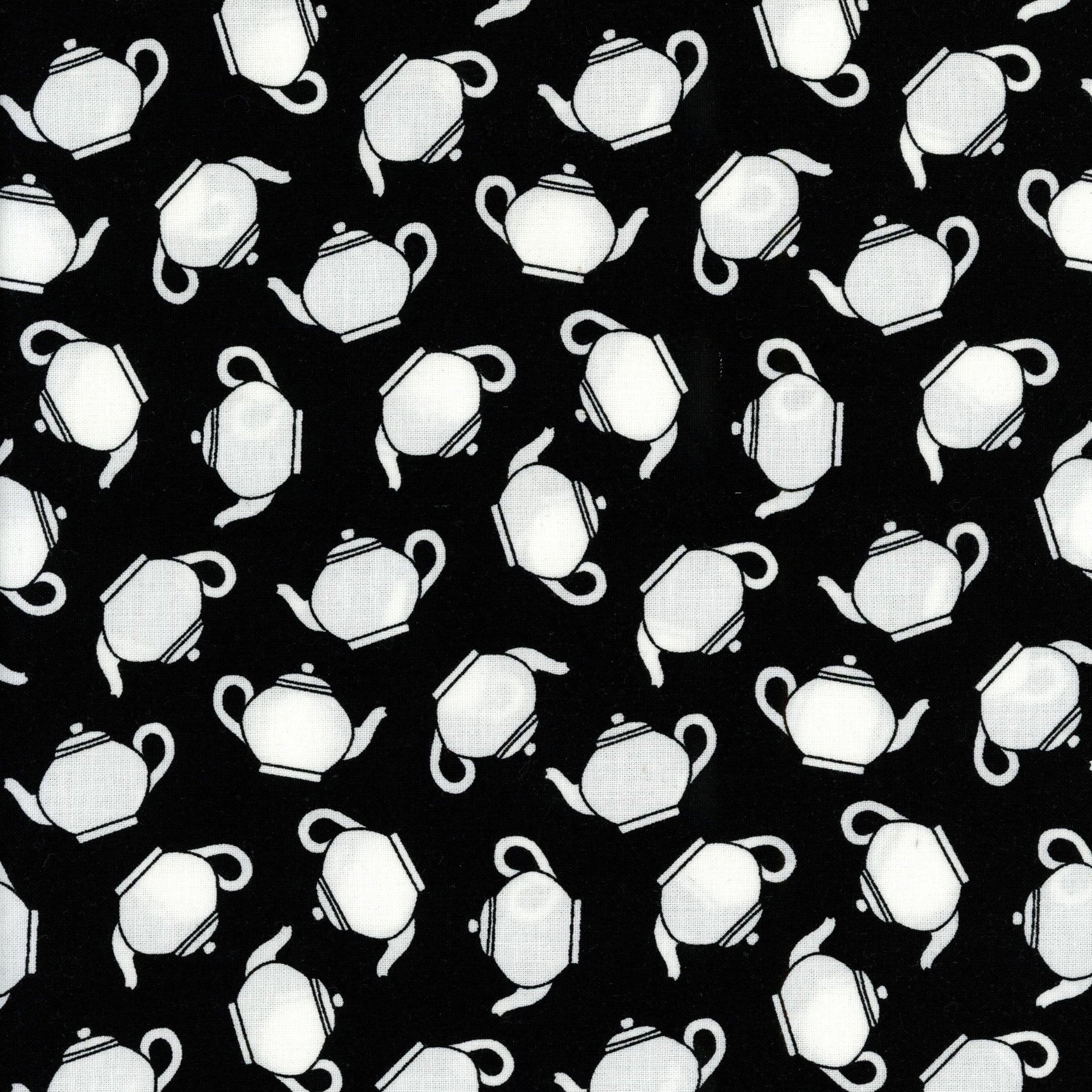 Design: White teapots in a scattered repeat on a solid black background