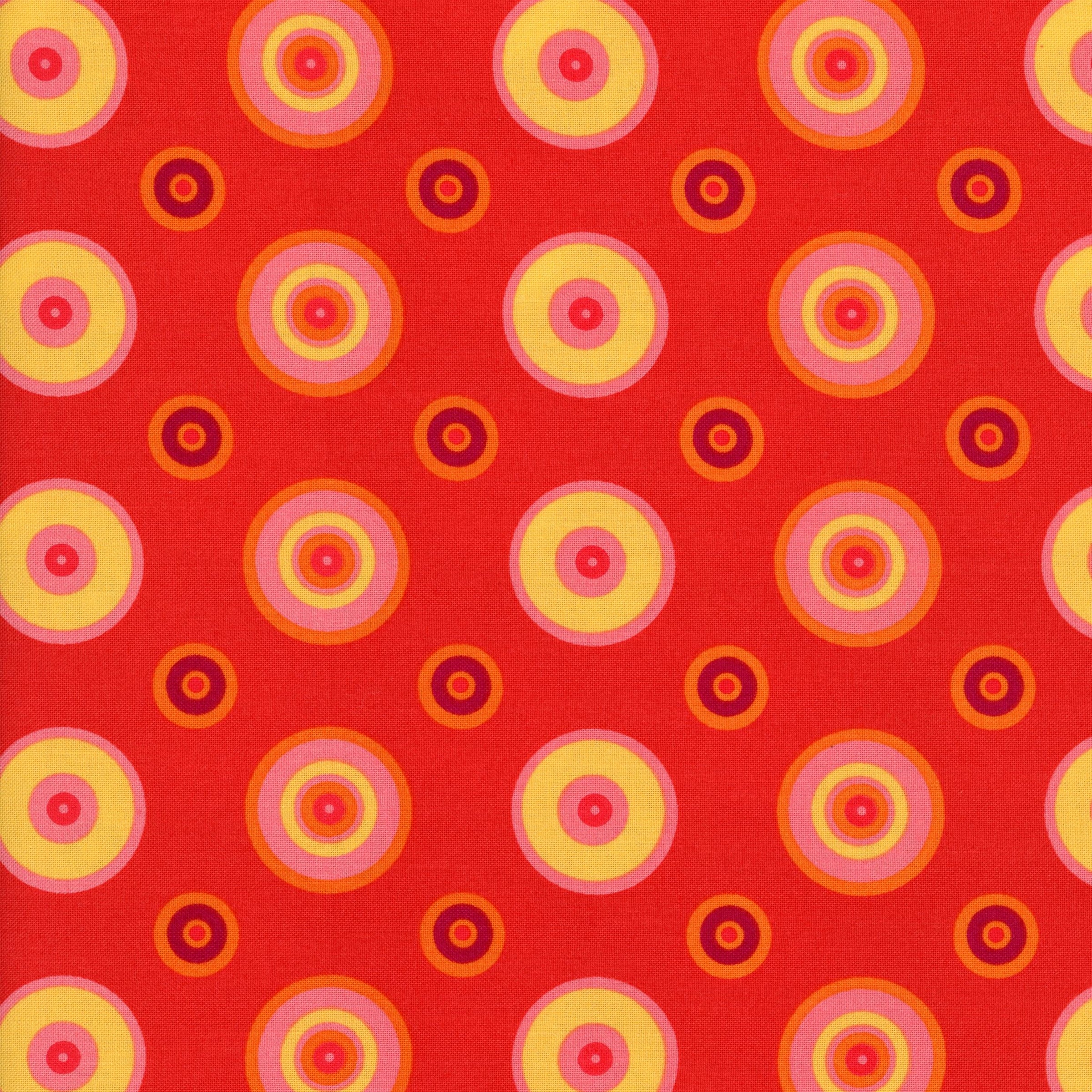 Add a bold splash of retro flair to your next sewing project with this eye-catching fabric from Moda’s Creativity Roars collection. Featuring playful concentric circles in vibrant shades of yellow, pink, and orange set against a fiery red background, this print is full of movement and energy. Perfect for bringing a pop of colour and personality to any creative project, from quilts and bags to home décor accents.