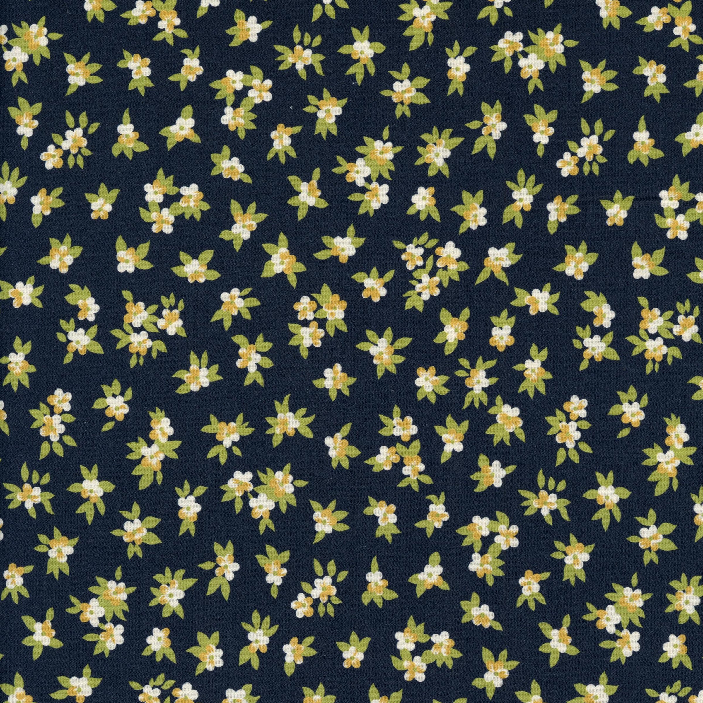 Fresh and elegant, Midnight Blossom Chelsea Garden from Moda Fabrics features delicate white and yellow blossoms scattered across a deep navy background, with accents of soft green foliage. This charming floral design is both timeless and versatile, perfect for adding a touch of nature-inspired beauty to quilts, patchwork, and sewing projects.