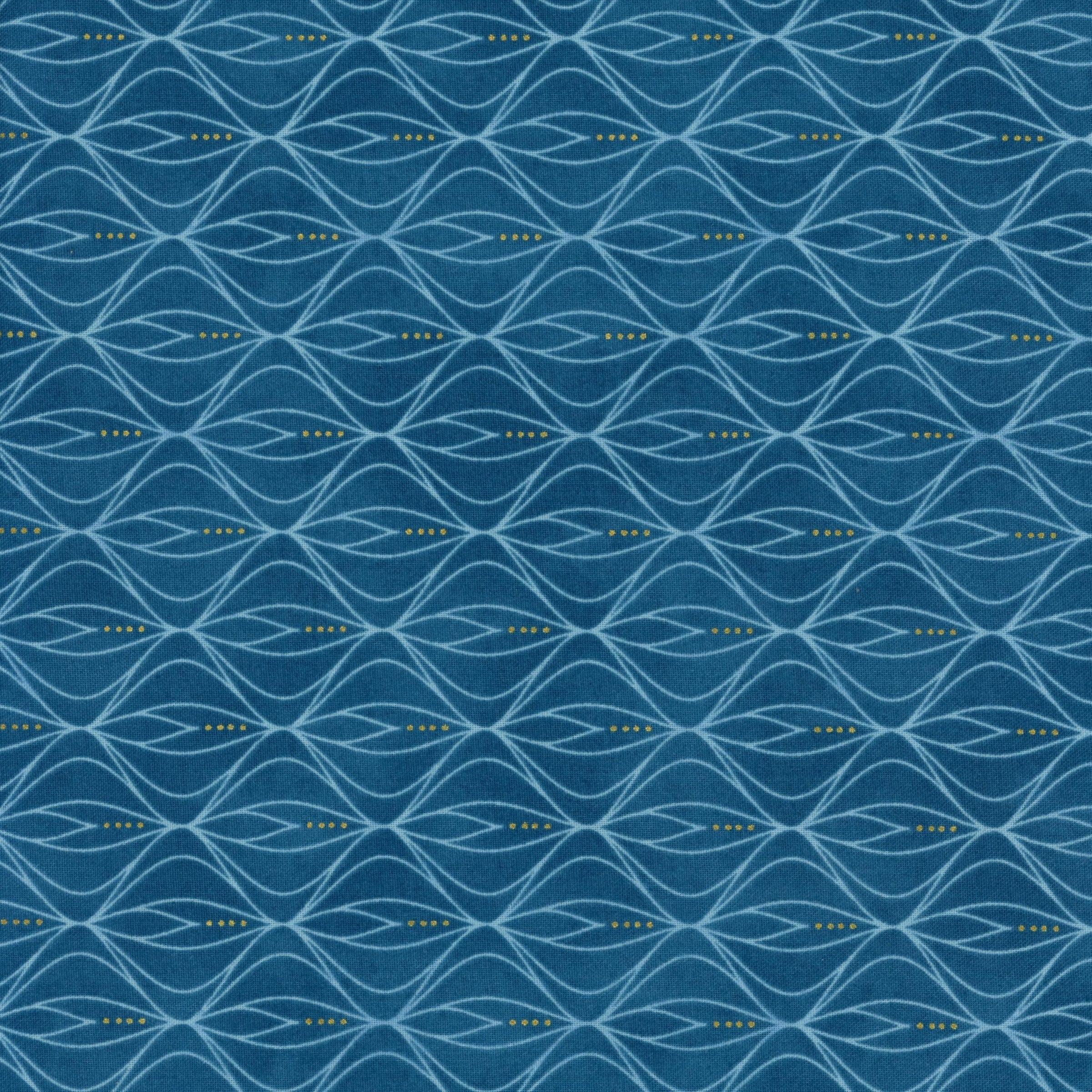 Add a modern touch of flow and rhythm to your projects with Ocean Wave Flirtation from Moda Fabrics. This design features soft, interlocking wave-like patterns in shades of blue, accented by delicate golden dots for a subtle pop of detail. Contemporary yet versatile, this fabric makes a stunning choice for quilting, patchwork, and stylish sewing projects.