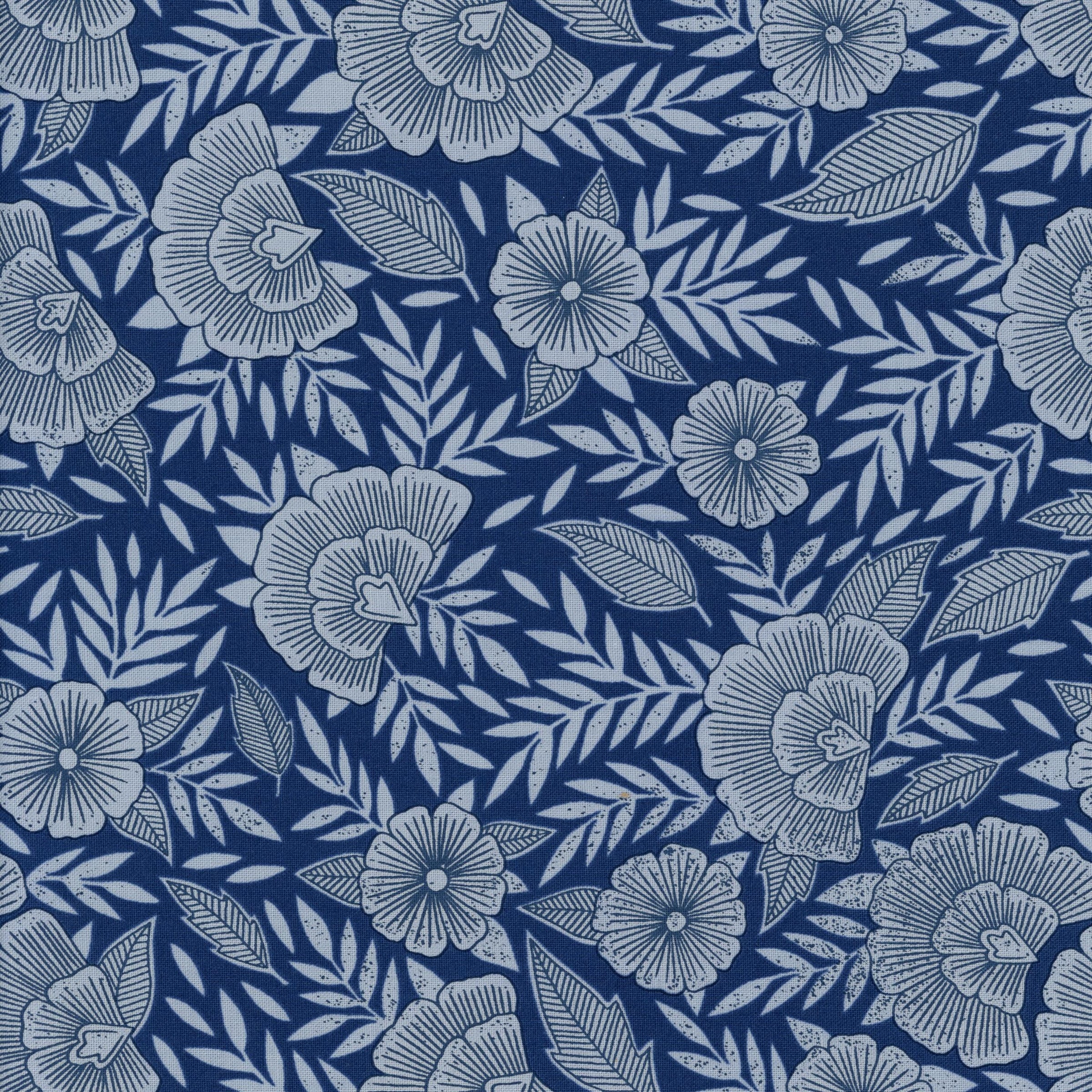 From Flower Press by Katharine Watson for Moda Fabrics, this stunning design features bold hand-drawn florals and leafy motifs in tonal shades of blue. The layered pattern captures the look of traditional block printing, giving the fabric a handcrafted, artistic feel. Perfect for bringing depth and texture to your quilting, patchwork, or home décor projects, this indigo-inspired print adds both charm and sophistication to any creation.