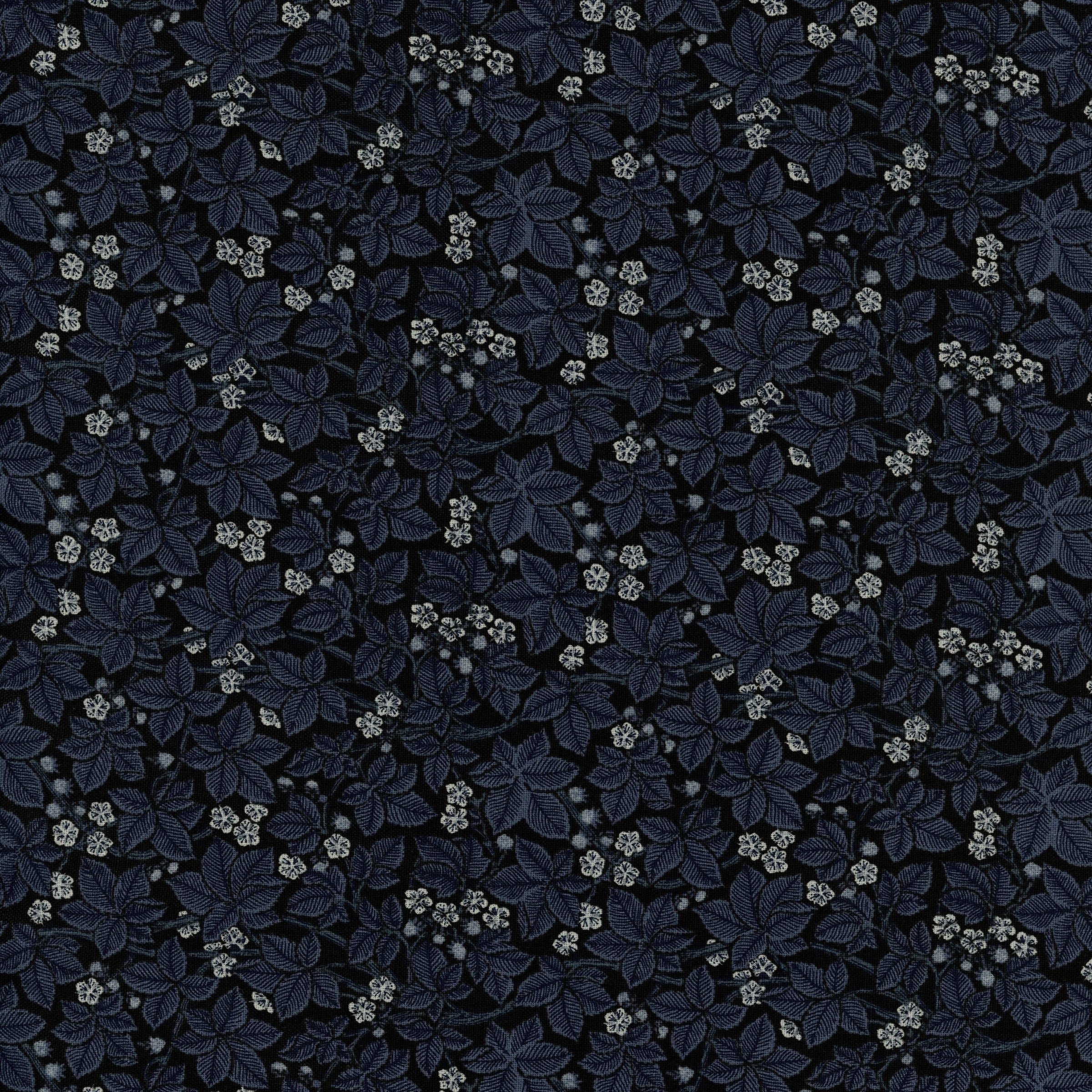 Design: Intricate floral and leafy pattern in navy with small silver blossoms