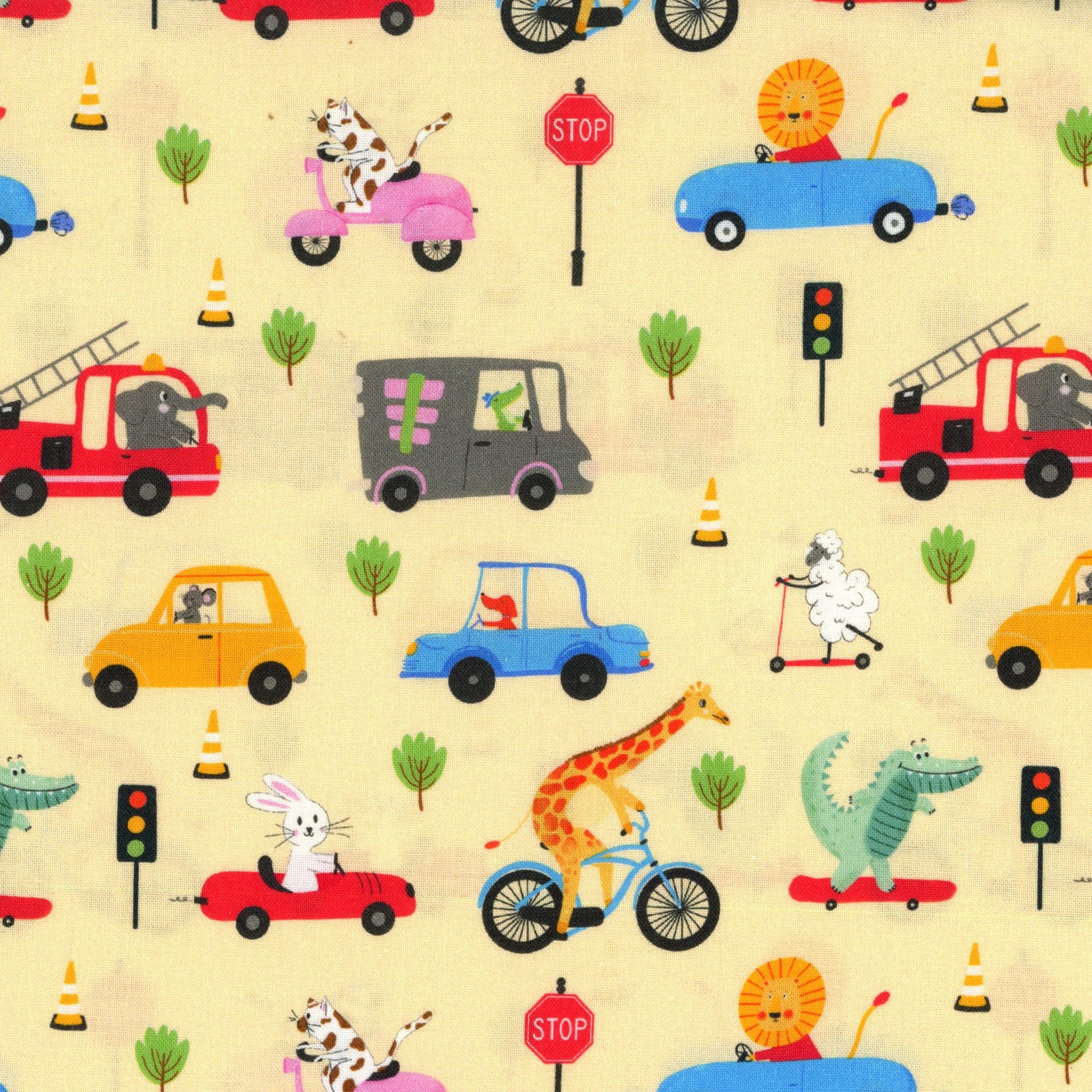 The Nutex – Peak Hour by Mel Armstrong Art & Illustration fabric brings a playful sense of fun to your sewing projects. Featuring a whimsical city scene where animals drive cars, ride scooters, pedal bikes, and zoom on skateboards, this print is full of character and colour. With lions, giraffes, crocodiles, bunnies, and more navigating roads with traffic lights, signs, and trees, it’s a lively design that will delight children and add charm to any project. Perfect for quilts, children’s décor, and novelty craft creations.