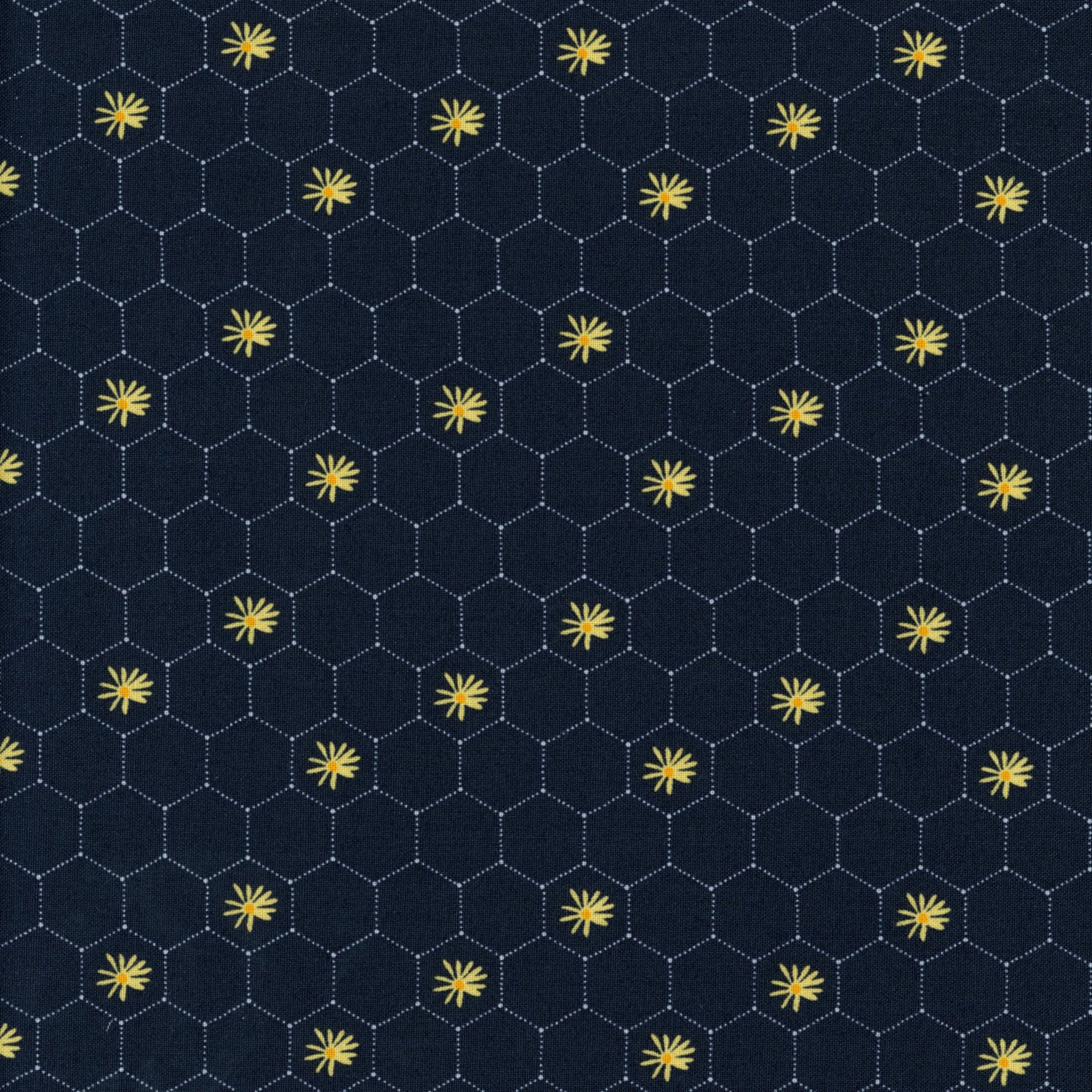 Sweet and sophisticated, Sunshine & Chamomile by Poppie Cotton brings a touch of country charm to your sewing projects. Honeycomb & Navy features a delicate hexagon grid pattern adorned with tiny yellow blossoms that resemble golden honey drops, all set against a rich navy background. Perfect for adding a warm yet modern touch to your quilts, this print pairs beautifully with florals and ginghams from the same collection.