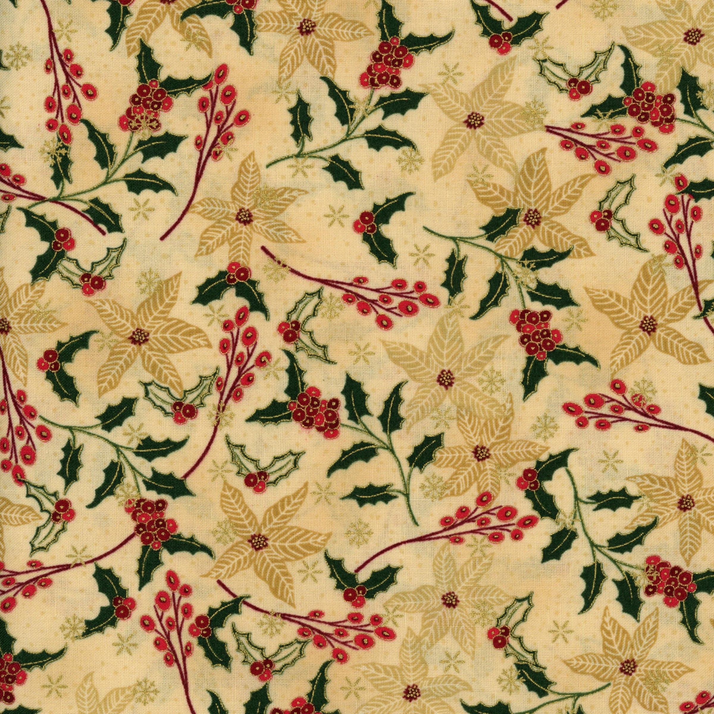 Design: Golden poinsettias, holly leaves, and red berries with metallic accents on a cream background