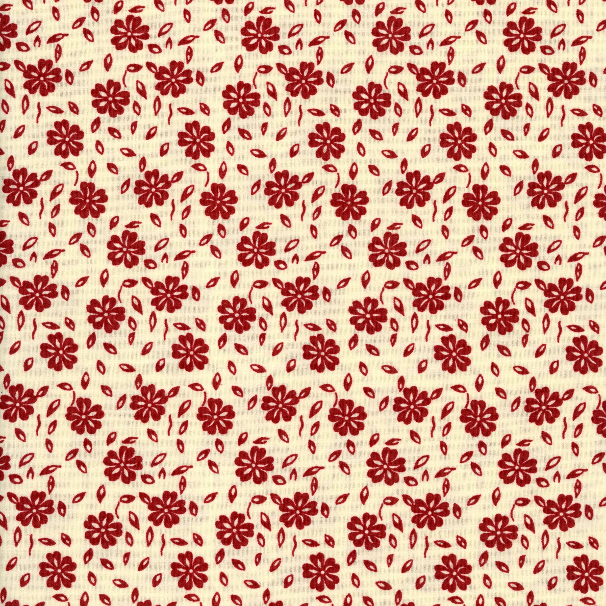 • Design: Tiny five-petal crimson flowers scattered with delicate seed-shaped leaves on a soft cream background, creating an even, small-scale repeat ideal for patchwork.