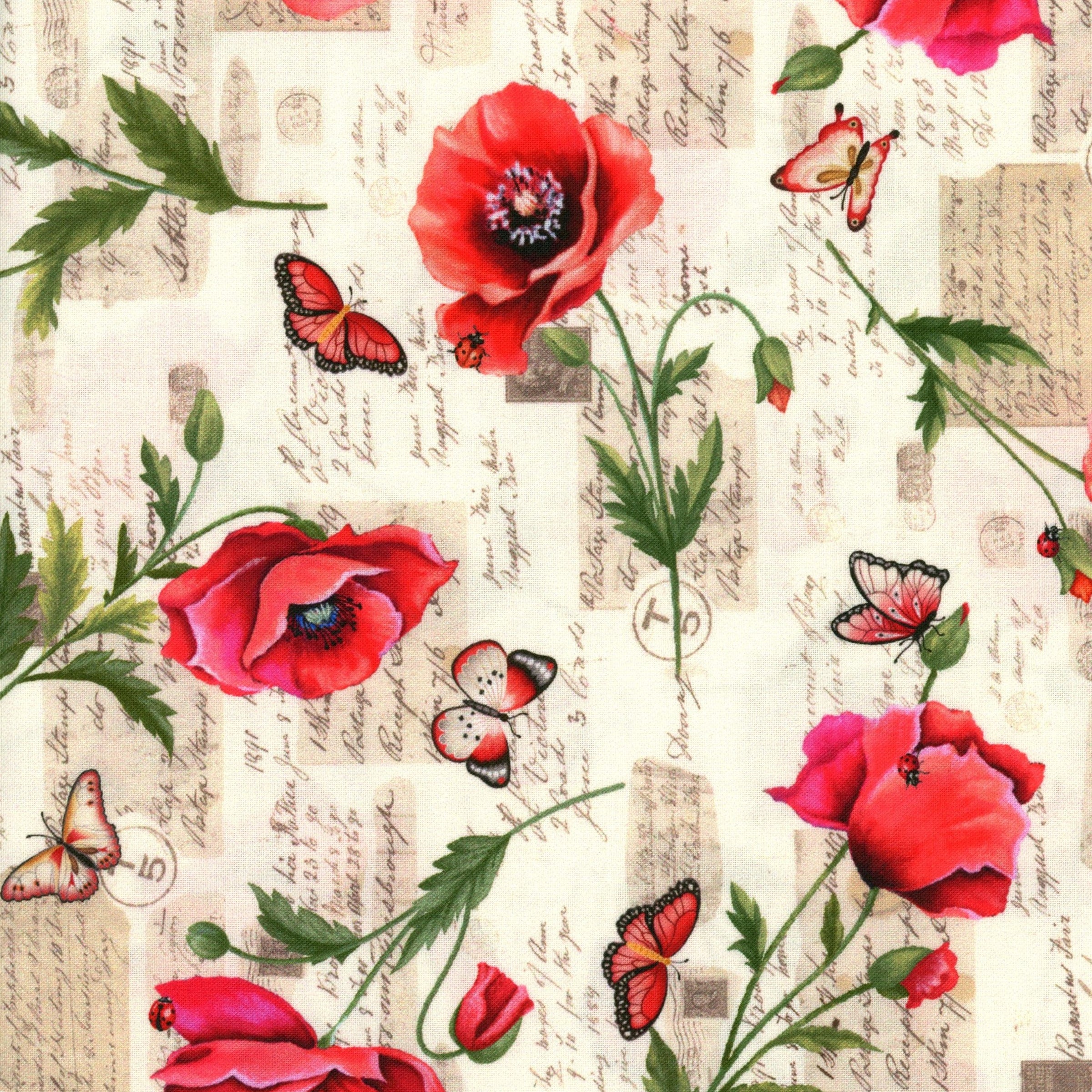 Bring timeless charm to your projects with Scarlet Poppies What's Poppin? by Michael Miller for KK Fabrics. This romantic design features vibrant red poppies intertwined with fluttering butterflies, scattered across a background of vintage-style postcards and handwritten letters. The contrast of bold florals against the soft script adds both elegance and nostalgia to your makes, perfect for lovers of vintage and botanical aesthetics.