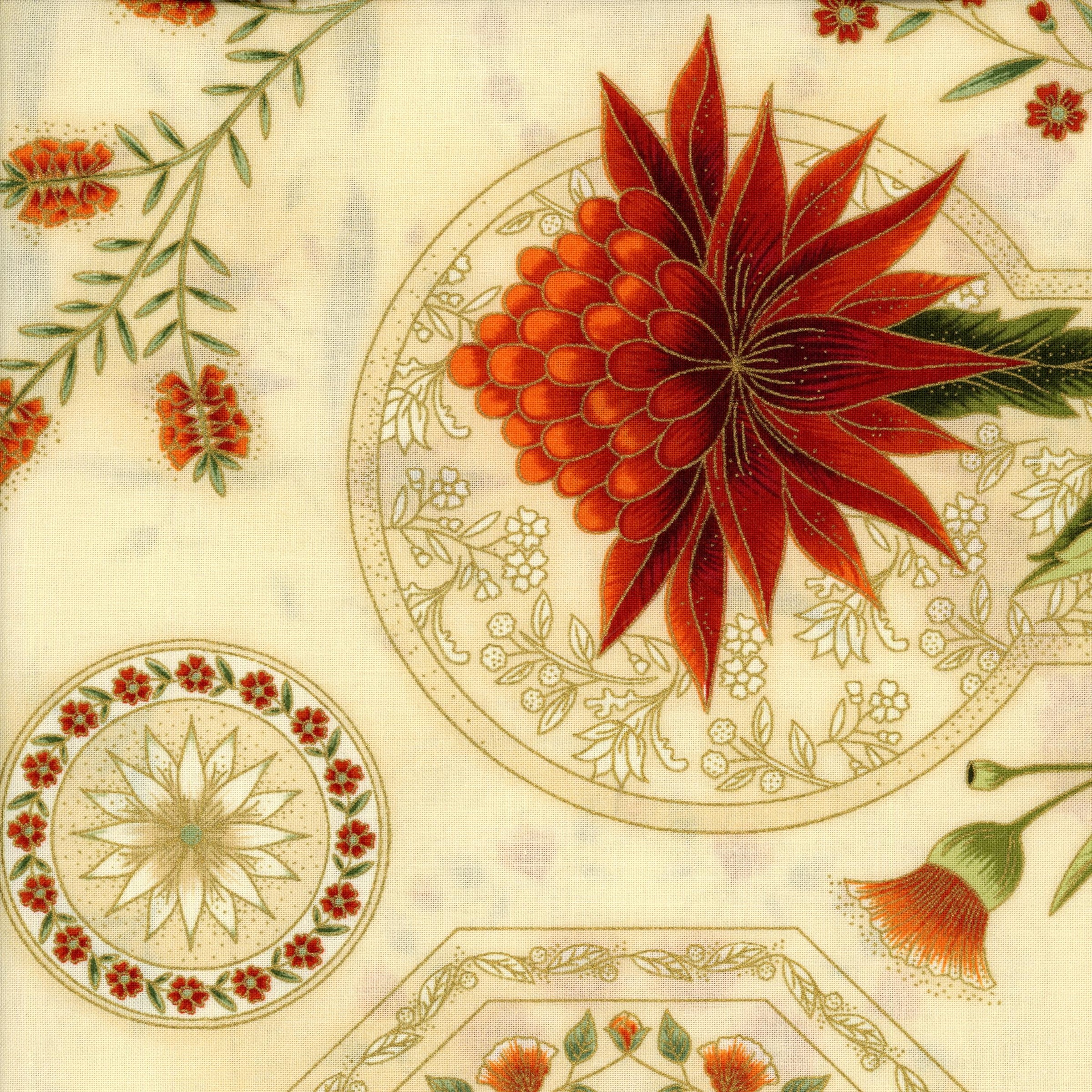 Celebrate the warmth and tradition of Australian-inspired design with Melba Mandala Rust by Leesa Chandler for The Textile Pantry. This elegant print features intricately detailed mandala medallions and floral motifs in rich tones of rust, deep red, olive, and warm gold, delicately accented with metallic highlights on a soft parchment background. Inspired by vintage embroidery and classic Australiana, this fabric evokes timeless beauty and a handcrafted aesthetic.