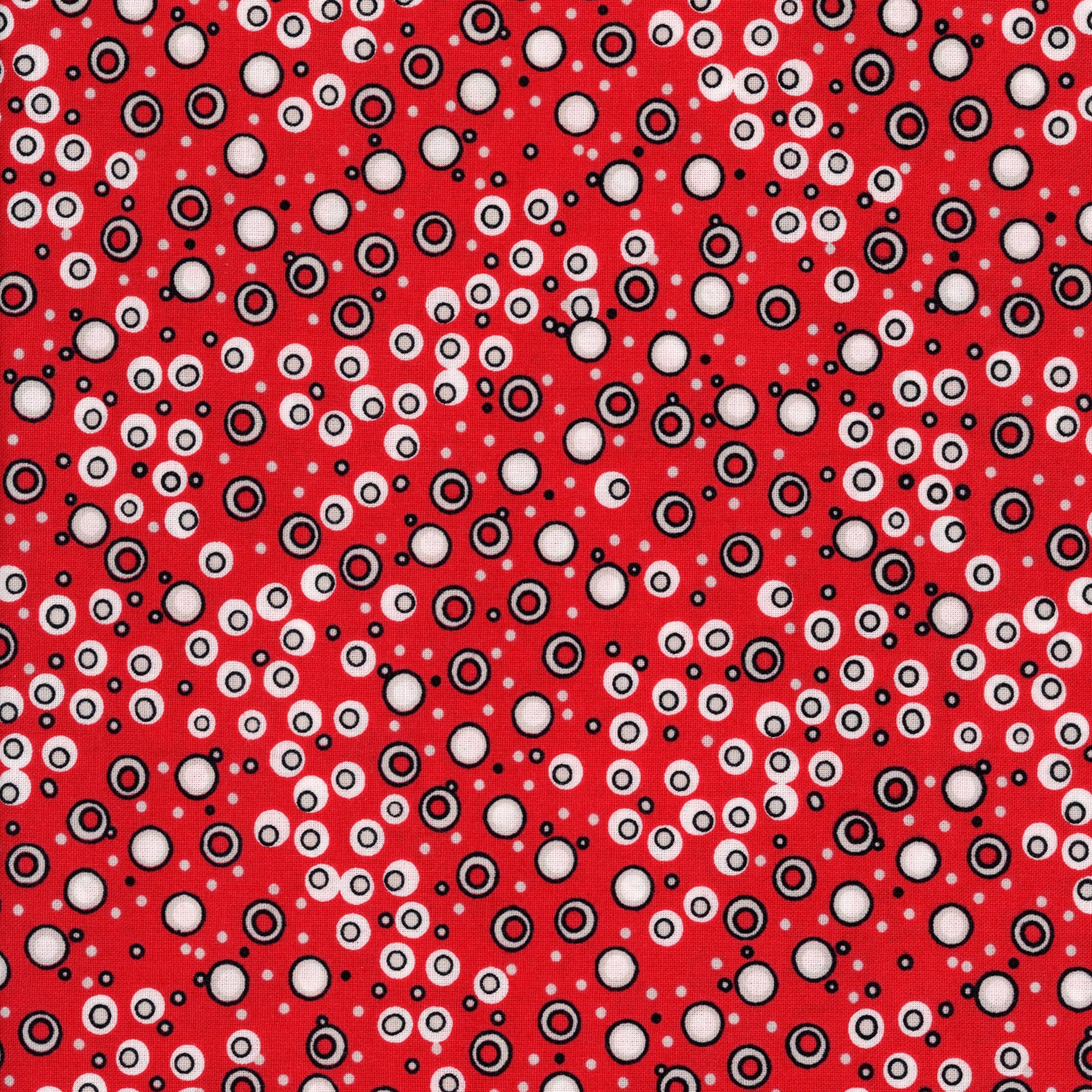 Bring a burst of cocktail-party sparkle to your next project with Black Tie Affair by Fabri-Quilt. This lively red quilting cotton is scattered with clusters of white and black concentric circles, creating the look of confetti tossed across a dance floor. The high-contrast palette makes it a modern alternative to classic polka dots, perfect for adding energy to patchwork blocks, borders or bold dressmaking accents.