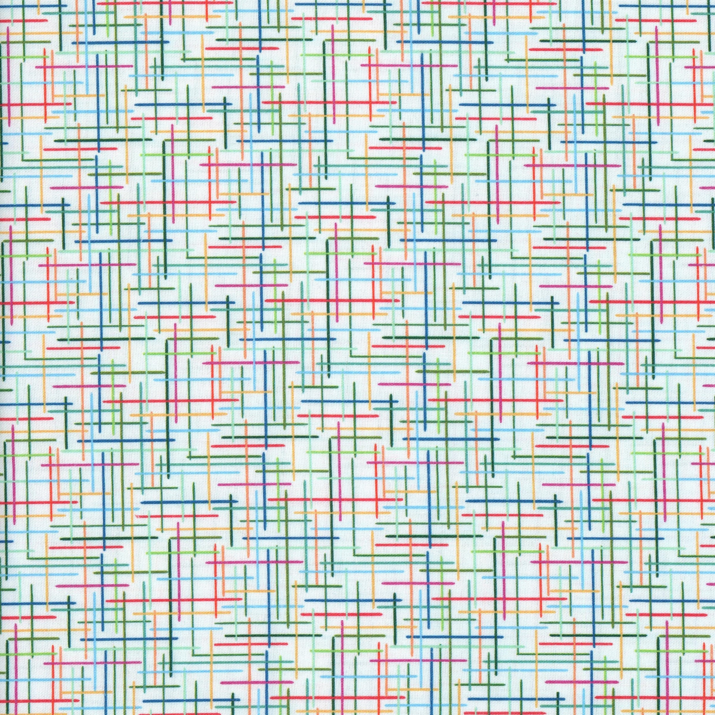 Bring energy and modern flair to your next project with Confetti Lines from KK Fabrics. This lively print features a tangle of fine, multicoloured lines layered in a loosely woven grid across a crisp white background. With hues of red, green, blue, orange, and pink interlacing at random intervals, this design is both structured and playfulperfect for adding a contemporary touch to quilting, patchwork, and bold fabric crafts.