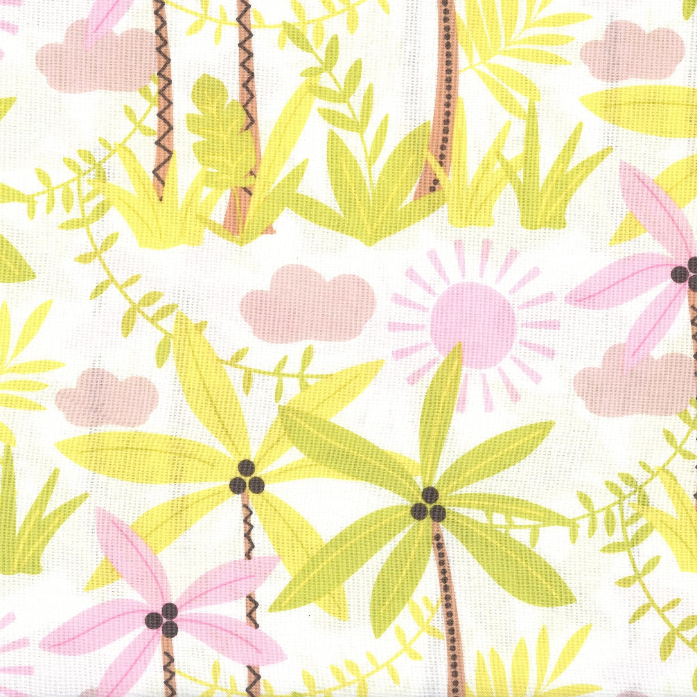Bright, fun, and full of sunny energy, Tropical Playtime from Maude Asbury’s Miney Moe collection for Blend Fabrics brings a whimsical twist to tropical design. Featuring cheerful palm trees, pink flowers, and playful suns and clouds in shades of lime, blush, and soft brown, this fabric evokes carefree summer days. Perfect for children’s projects, beach-themed quilts, or vibrant décor, it adds a pop of joy and imagination to any creation.