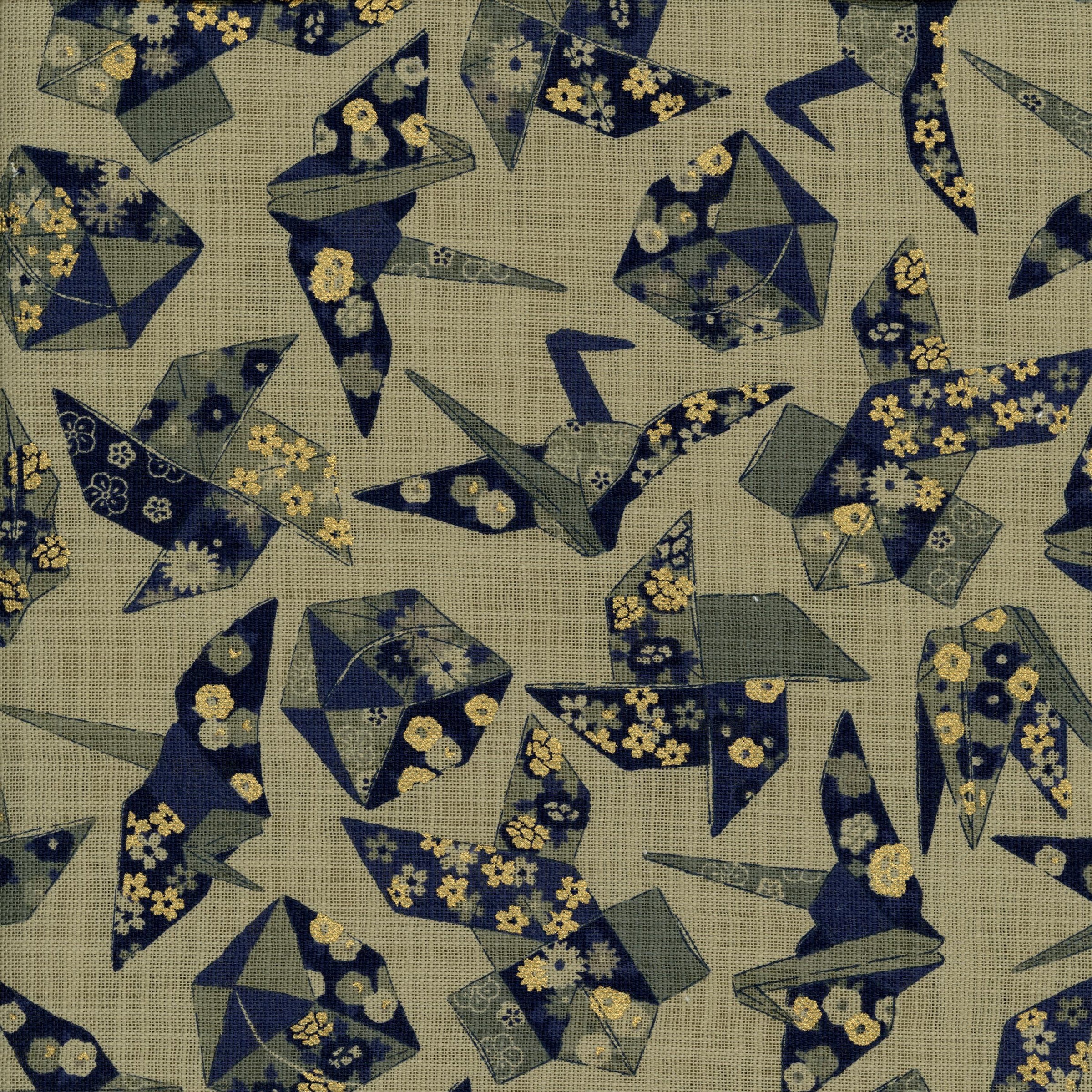 • Design: Origami cranes and folded shapes with Japanese floral patterns in gold and navy on a taupe-textured background