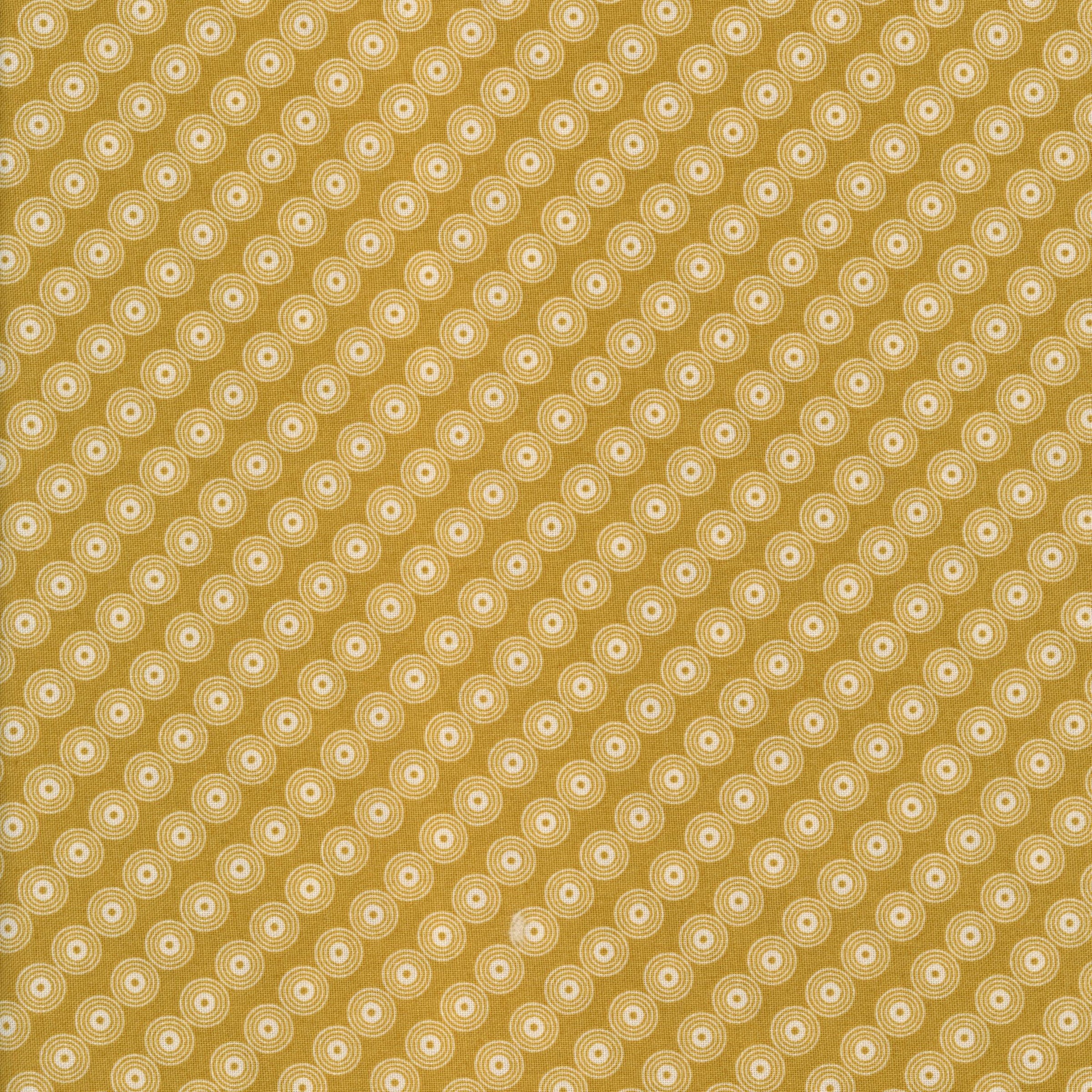 Design: Repeating concentric ivory circles on a rich mustard-gold ground; subtle diagonal layout for extra visual interest.