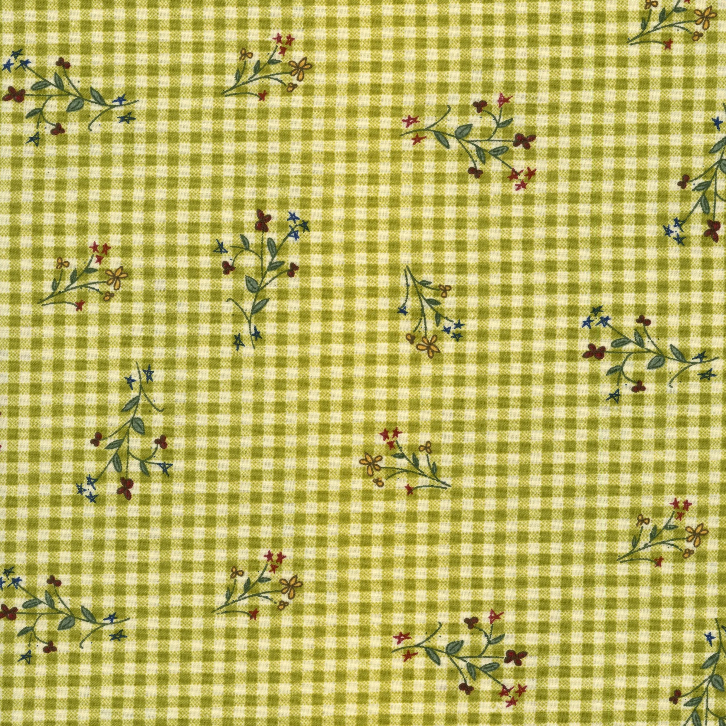 Bring a vintage charm to your next quilting project with "Flowerbranch on Checks" from the Leaving Riverton Collection by Jodi Barrows for Sullivans International. This delightful fabric pairs a soft olive gingham check with whimsical sprigs of tiny blue, burgundy, and gold flowers scattered across the surface. The blend of structured checks and delicate florals offers a timeless, countryside-inspired aesthetic perfect for heritage quilts or rustic-themed dcor.